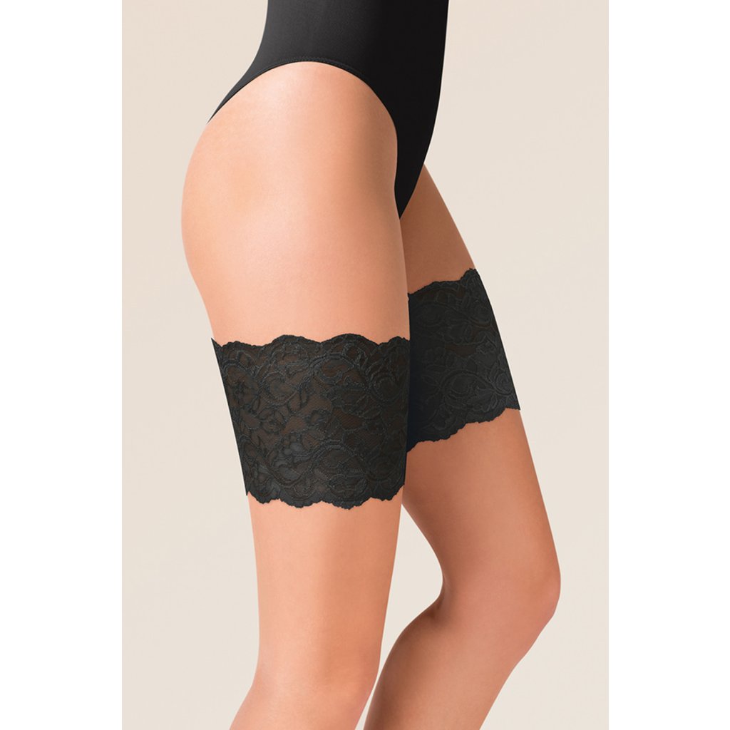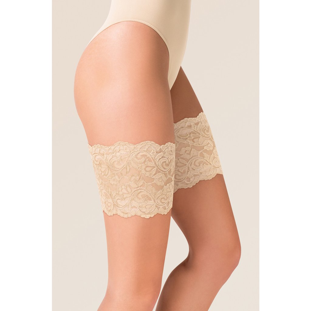 Samodržiaca ozdobná páska na stehná zo širokej čipky so silikónom, ktorá zaisťuje pohodlie a chráni pred odreninami.Zloženie: 90% polyamid, 10% elastan.