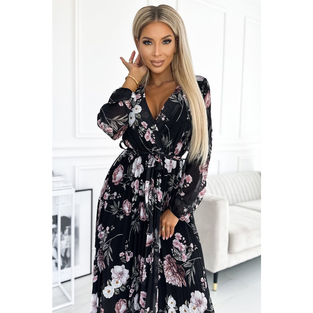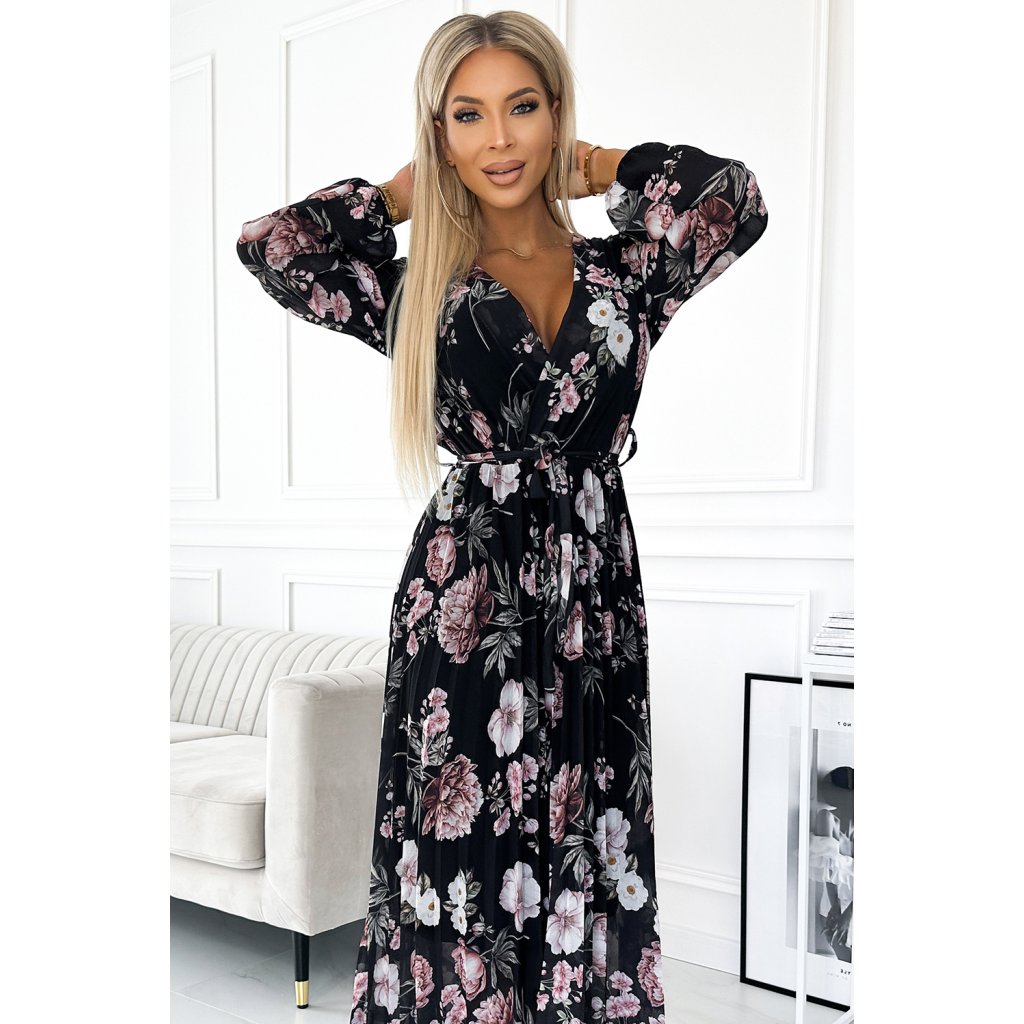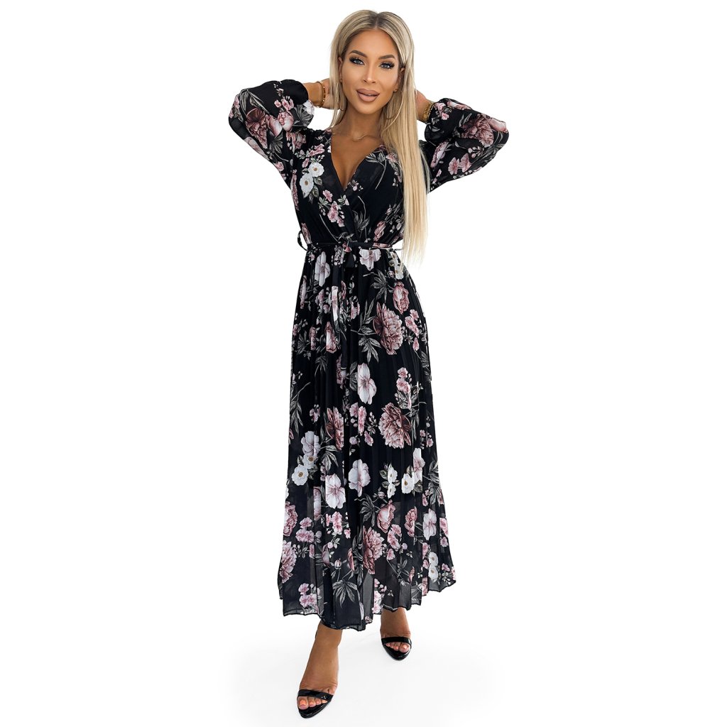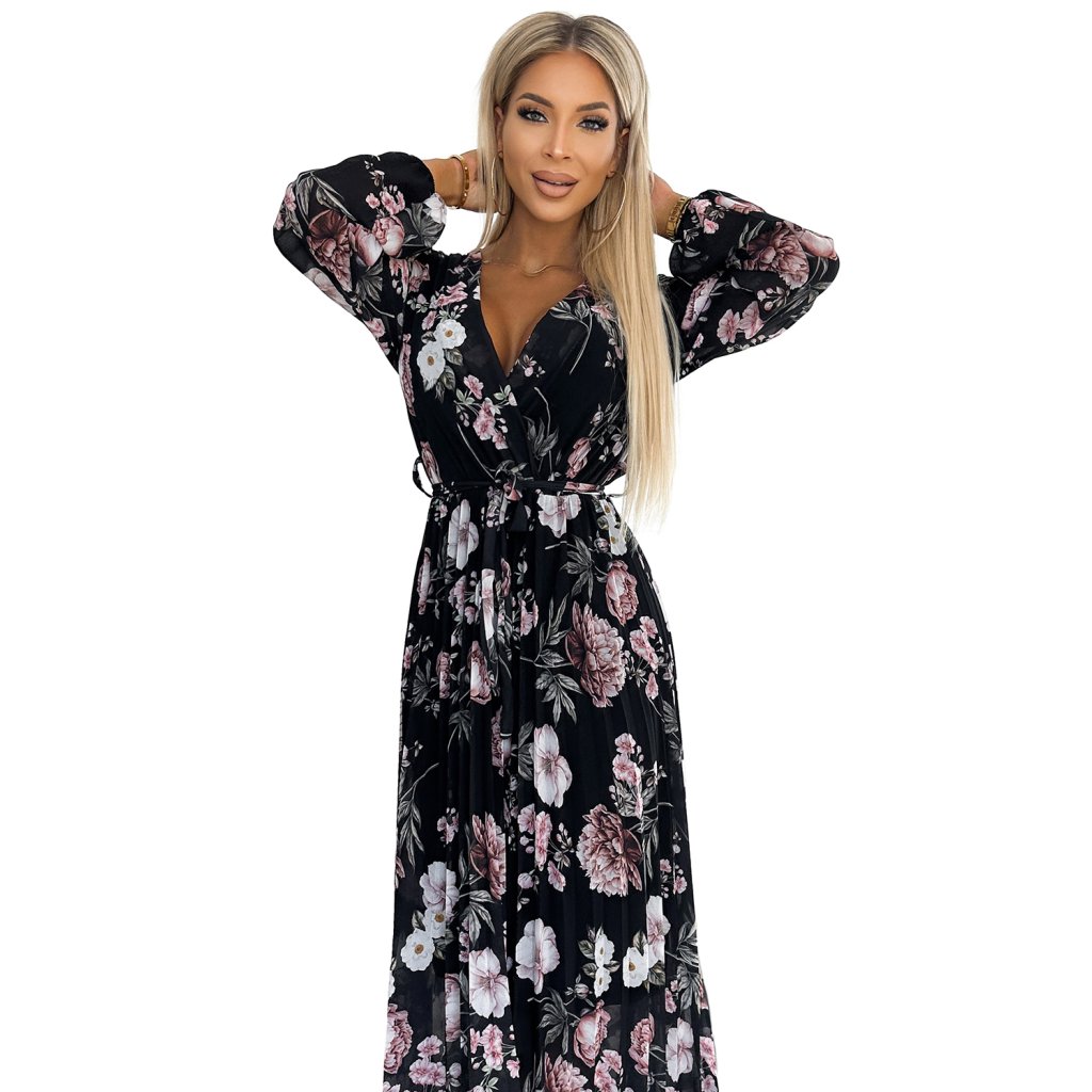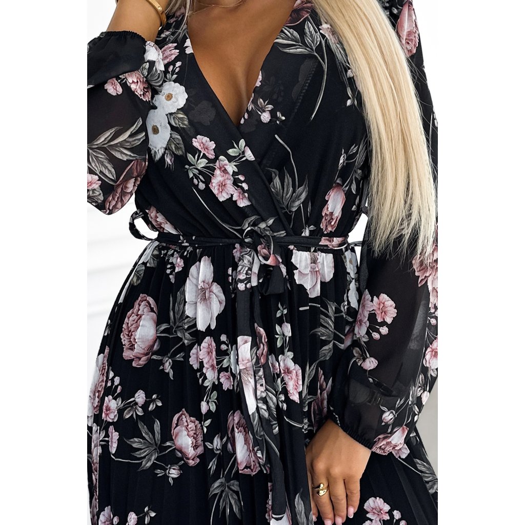 Plisované midi šaty s výstrihom, dlhým rukávom a zaväzovaním v páse - čierne s ružovými kvetmi 502-1