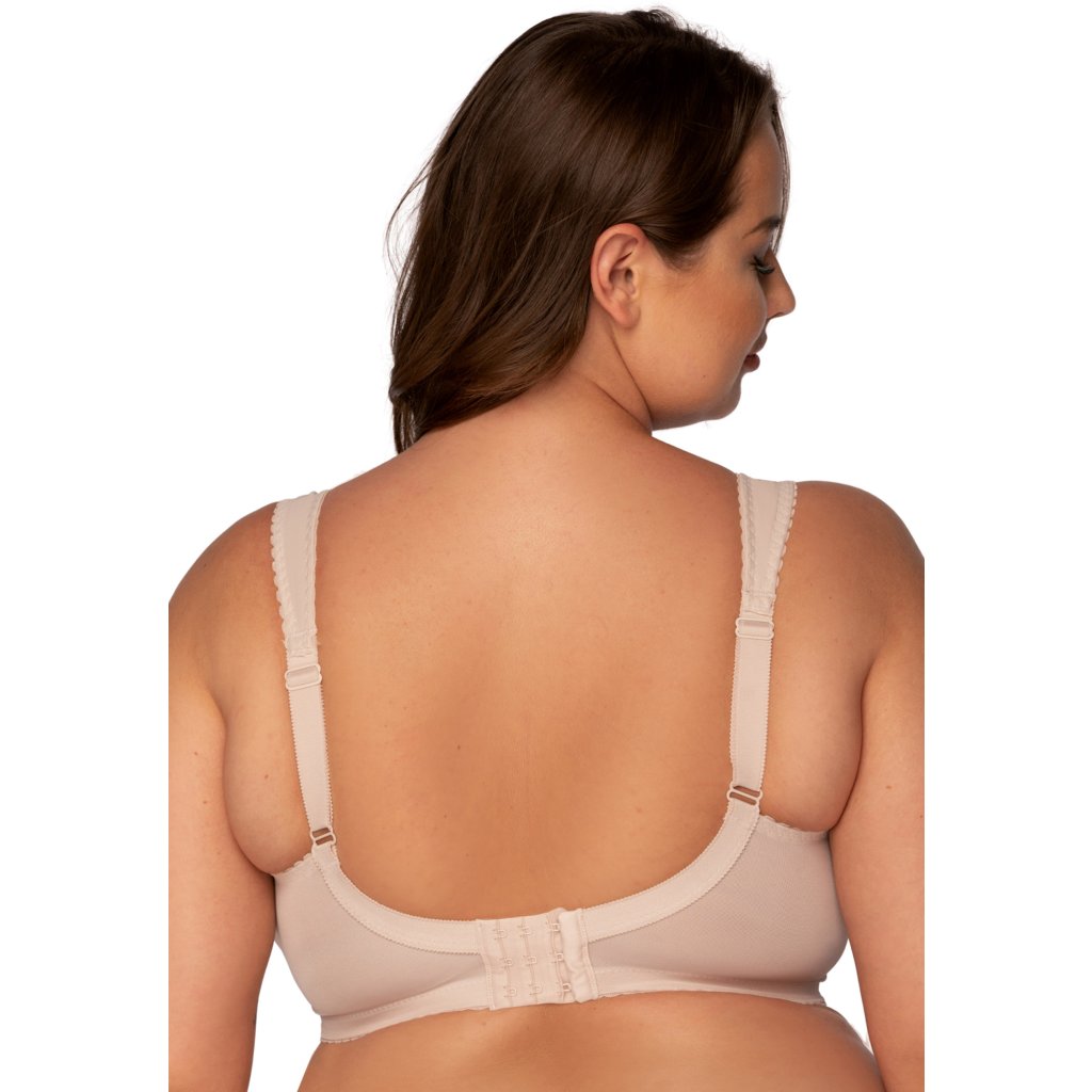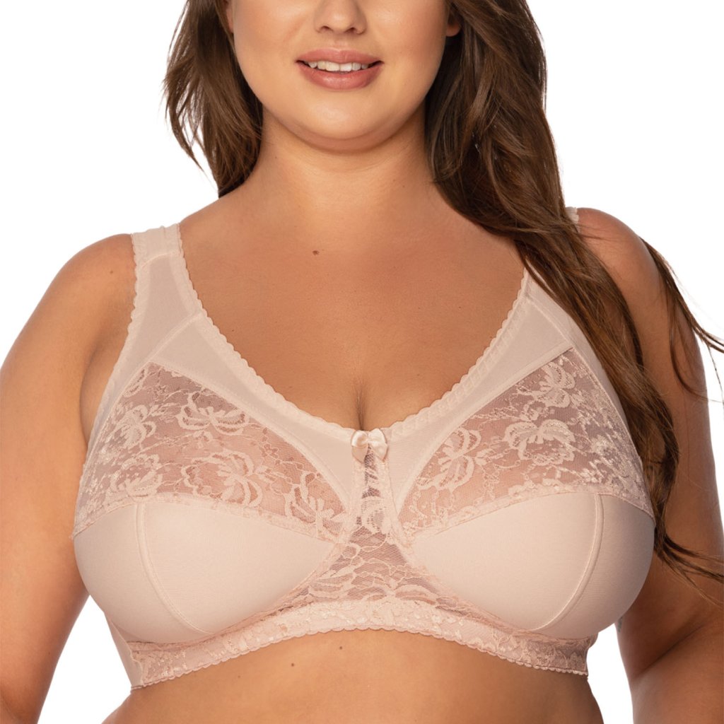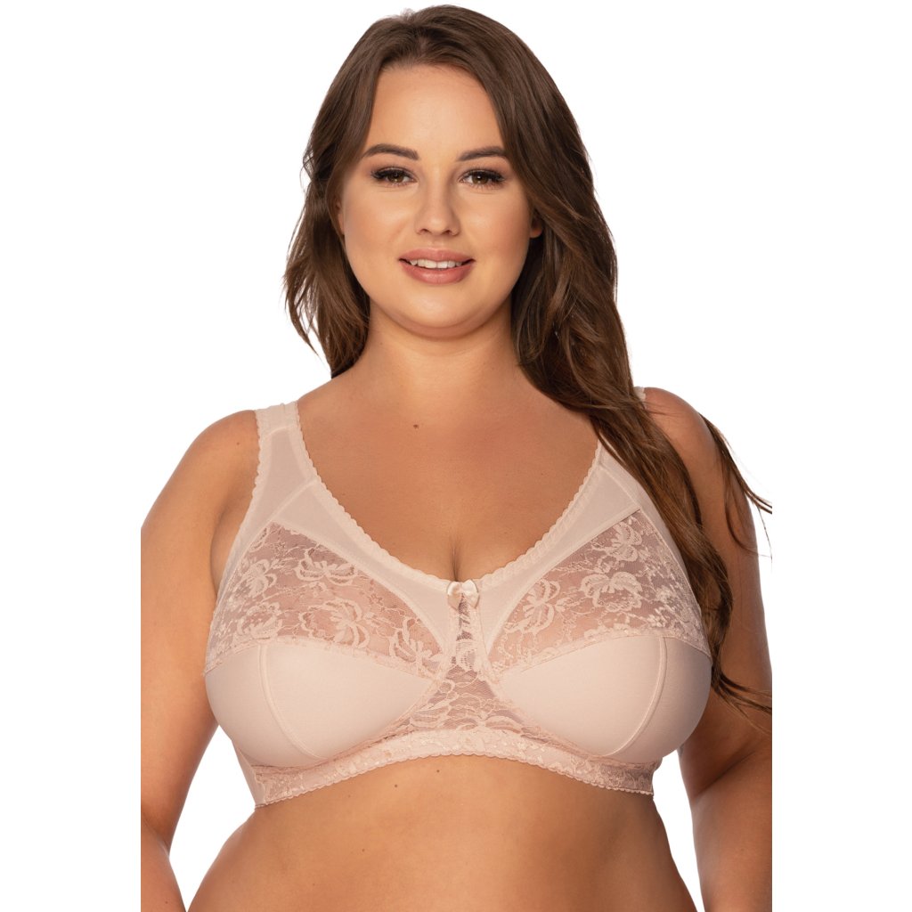 Pohodlná a komfortná podprsenka pre ženy s väčšími a plnšími prsiami.Mäkké košíčky nemajú kostice. Podprsenka je vyrobená zo sieťoviny a je z polovice podšitá látkou. Vrchná časť košíčkov je priesvitná a zdobená čipkou. V mieste spojenia košíčkov je saténová mašlička. Pohodlné široké ramienka sú zárukou komfortu pri nosení.