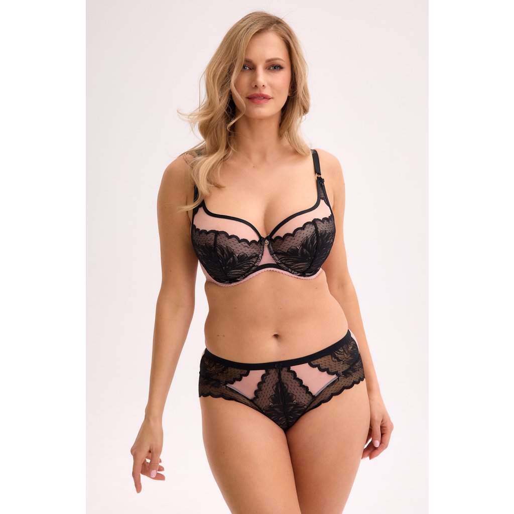 Gaia 1308 Amara je čiastočne vystužená podprsenka, ktorá kombinuje pevnú oporu s jemným a ľahkým pocitom. Spodné košíčky sú ľahko vystužené a kostice zaisťujú stabilný tvar a zdvih. Horné košíčky sú vyrobené z jemnej čipky, ktorá jemne splýva s prsiami a dodáva im nádych sofistikovanosti. Vnútro má mäkký lem pre celodenné pohodlie. Ramienka sú nastaviteľné a neodnímateľné, s kovovými sťahovacími pásikmi pre väčšiu odolnosť. Podprsenka sa zapína vzadu na háčiky, čo uľahčuje nastavenie veľkosti. Absencia zvislých bočných kostíc zvyšuje voľnosť pohybu a pohodlie. Starostlivo upravený nosník a okraje košíčkov zdôrazňujú elegantný charakter tohto modelu. Je to voľba na každodenné nosenie, ktorá dobre priľne k telu a poskytuje pocit sebavedomia každý deň.Čiastočne vystužené košíčky pre pevnú oporu