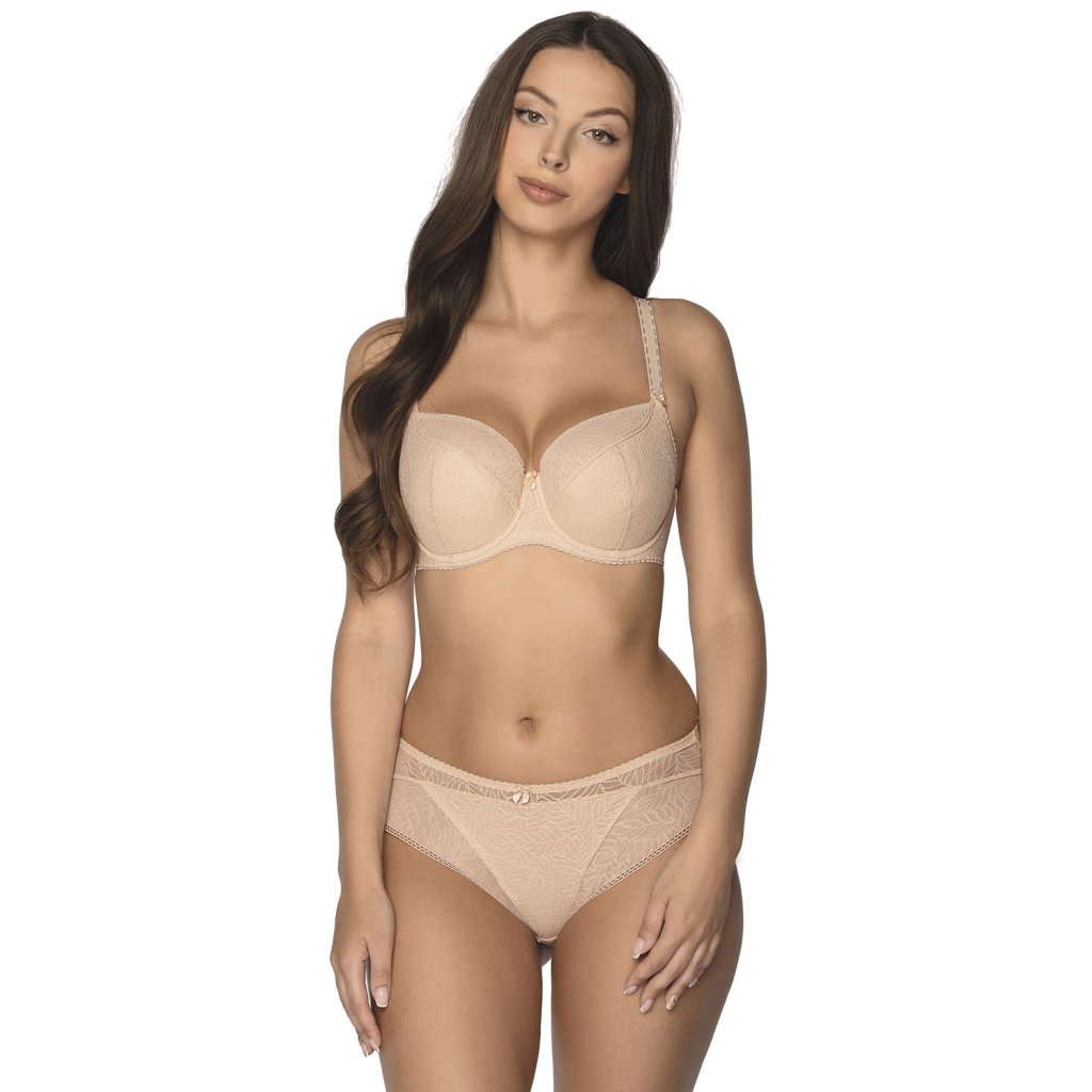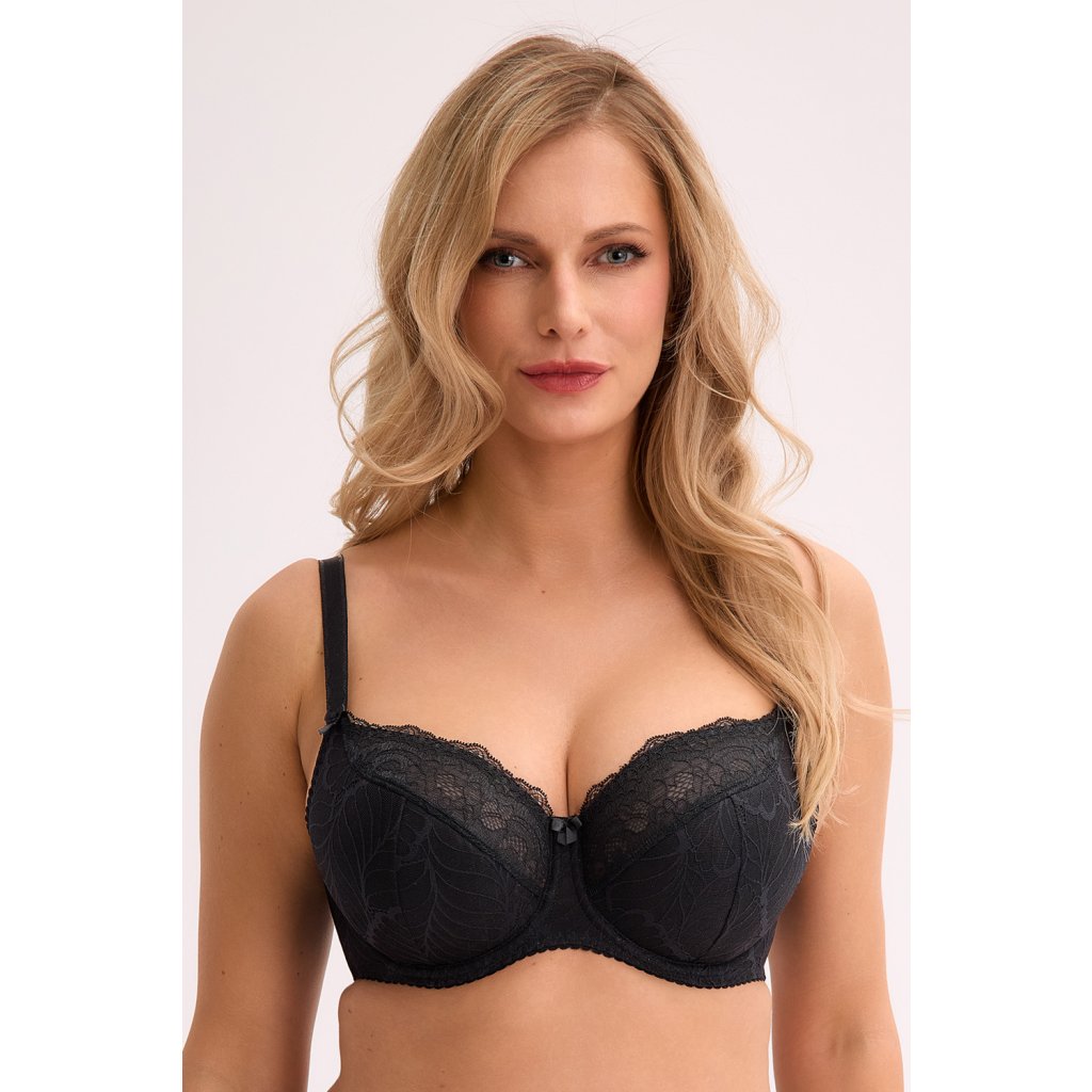 Elegantná polovystužená podprsenka. Košíčky a mostík (stredná časť) sú pokryté jemnou čipkou. Za osobitnú pozornosť stojí strih tejto podprsenky s vyvýšeným stredom. Zadná časť je vyrobená z hrubšej elastickej sieťoviny. Spodná časť košíčkov je vyrobená z tenkej peny, ktorá je vnútri košíčkov potiahnutá 100 % bavlnou. Podprsenka perfektne sedí vďaka použitým materiálom a prepracovanému strihu. Krásne nadvihne a zaoblí poprsie. Oceníte aj bočné kostice a dvojradové zapínanie na háčiky a slučky s trojstupňovou reguláciou obvodu. Ozdobné popruhy sa dajú nastaviť, ale nedajú sa odstrániť. Celkový dojem podprsenky dotvárajú jemné mašličky umiestnené v strede podprsenky a v mieste, kde sa ramienka stretávajú s košíčkami.Na vytvorenie súpravy odporúčame nohavičky Sandy.