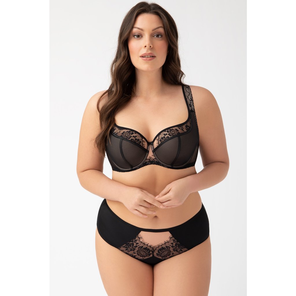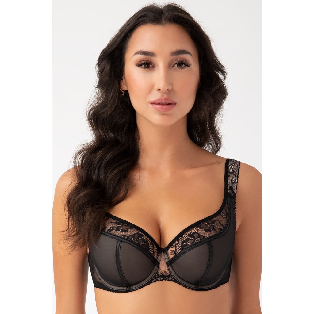 Krásna, pohodlná, polovystužená podprsenka z krásneho tylu v kombinácii s čipkou. Tento model sa dodáva v troch farbách: čiernej, krémovej a zelenej.Mäkká penová výplň na dne pohárov. Vrchná časť košíčkov podprsenky je na spevnenie podšitá tylom. Stred podprsenky dokonale prilieha k mostíku. Boky sú vyrobené z elastickej vysokogramážnej lycry. Košíčky sú profilované drôtom okolo poprsia. Vďaka tomu sa prsia dokonale stlačia dovnútra, zdvihnú a zachovajú si krásny, zaoblený tvar.
