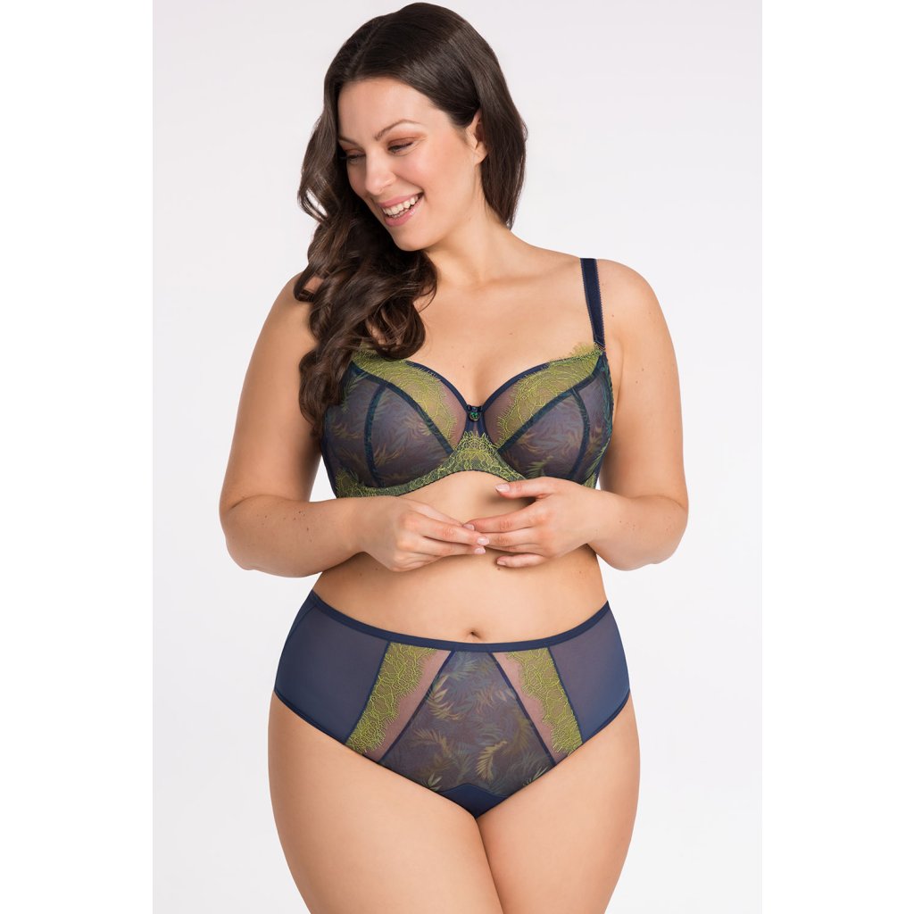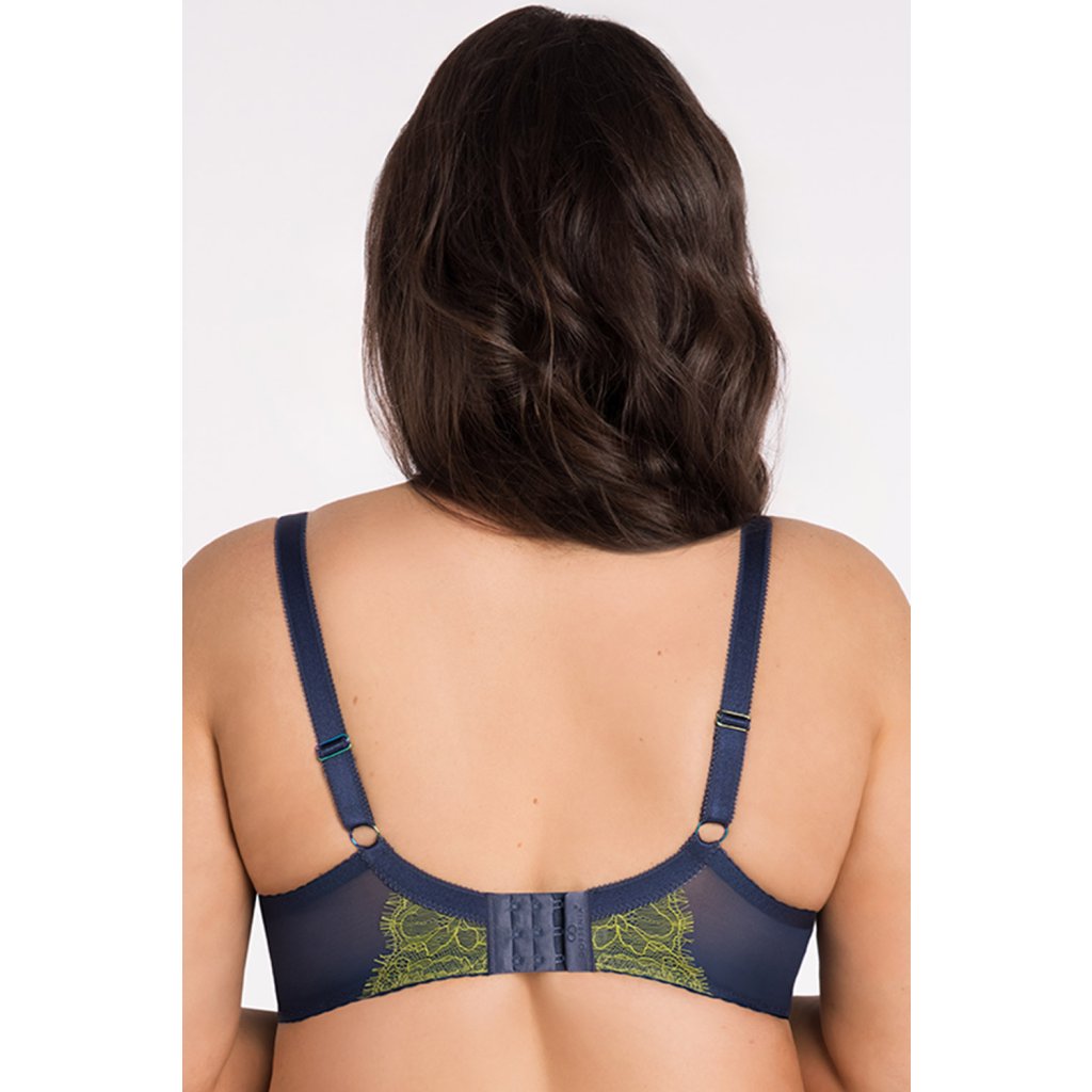 Nevystužená podprsenka pre ženy so stredne veľkými, veľkými a veľmi veľkými prsiami v tmavomodrej farbe.- poskytuje efekt zdvíhania a zbierania pŕs dovnútra