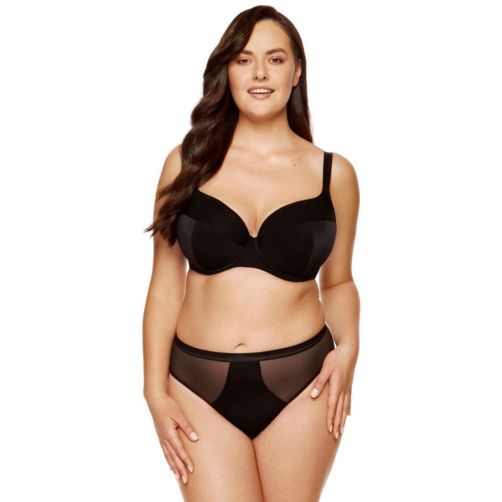 Elegantná vystužená podprsenka v čiernej farbe.- košíčky a košíčky sú vyrobené z čiernej pleteniny s jemným károvaným vzorom