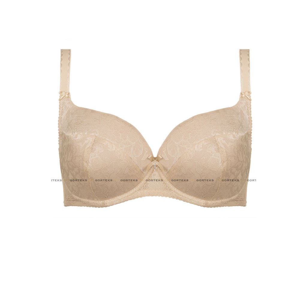 Elegantný, vystužený model podprsenky. Dodáva prsiam krásny, okrúhly tvar. Košíčky sú potiahnuté mäkkou, čipkovanou tkaninou, ktorá je elastická a lesklá. Obvod je vyrobený z jemnej sieťoviny. Krásna mašľa medzi šálkami je doplnená kryštálom a tvorí elegantný doplnok. Košíčky sú úplne vystužené mäkkou penovou výstuhou. Vnútorná strana je bavlnená. Ramenné popruhy sú voľne nastaviteľné. Vertikálne švy pomáhajú udržať obvod v stabilnej polohe bez pokrčenia.65% polyamid, 20% polyester, 10% bavlna, 5% elastan