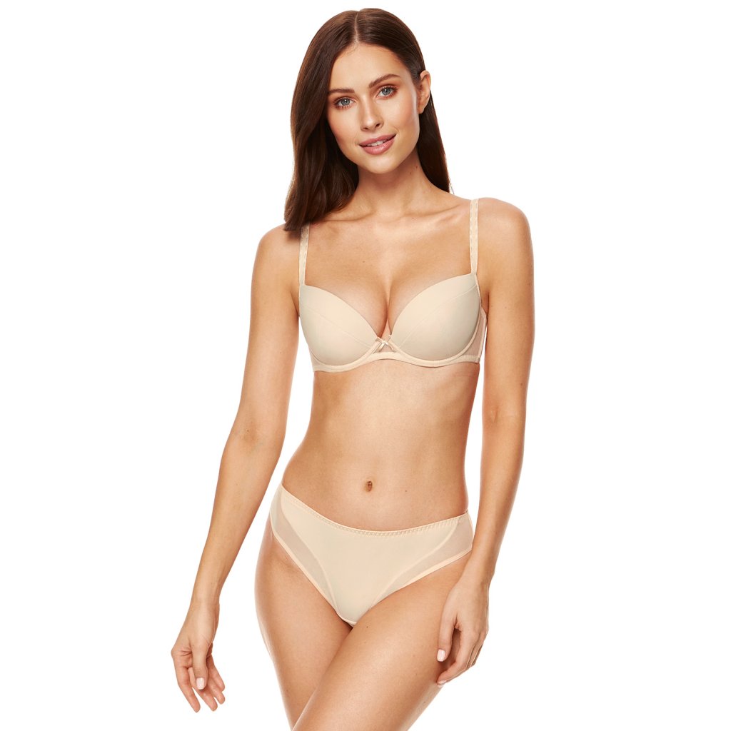 Klasická push-up podprsenka v béžovej farbe.- šálky potiahnuté z vonkajšej strany hladkou pleteninou