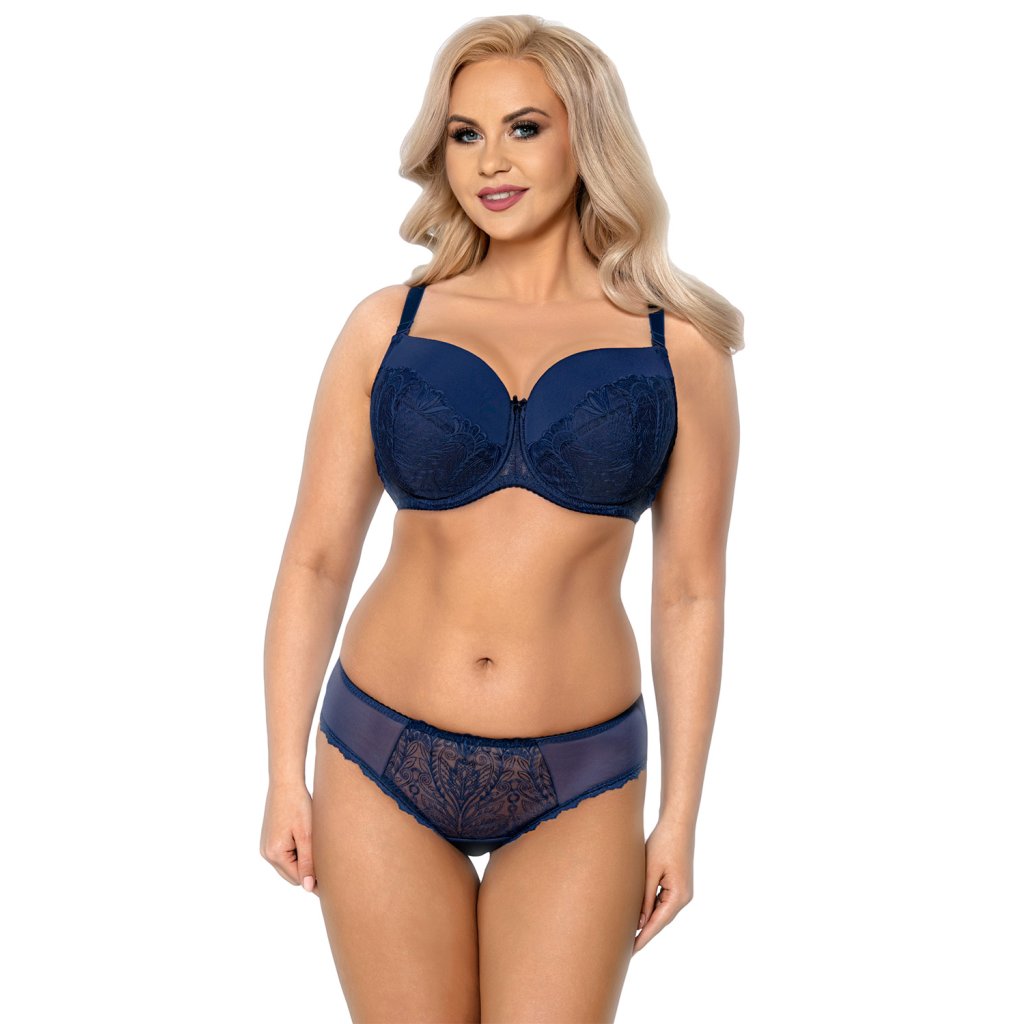 Elegantná vystužená podprsenka v tmavomodrej farbe.- šálky z hladkého materiálu a výšivky