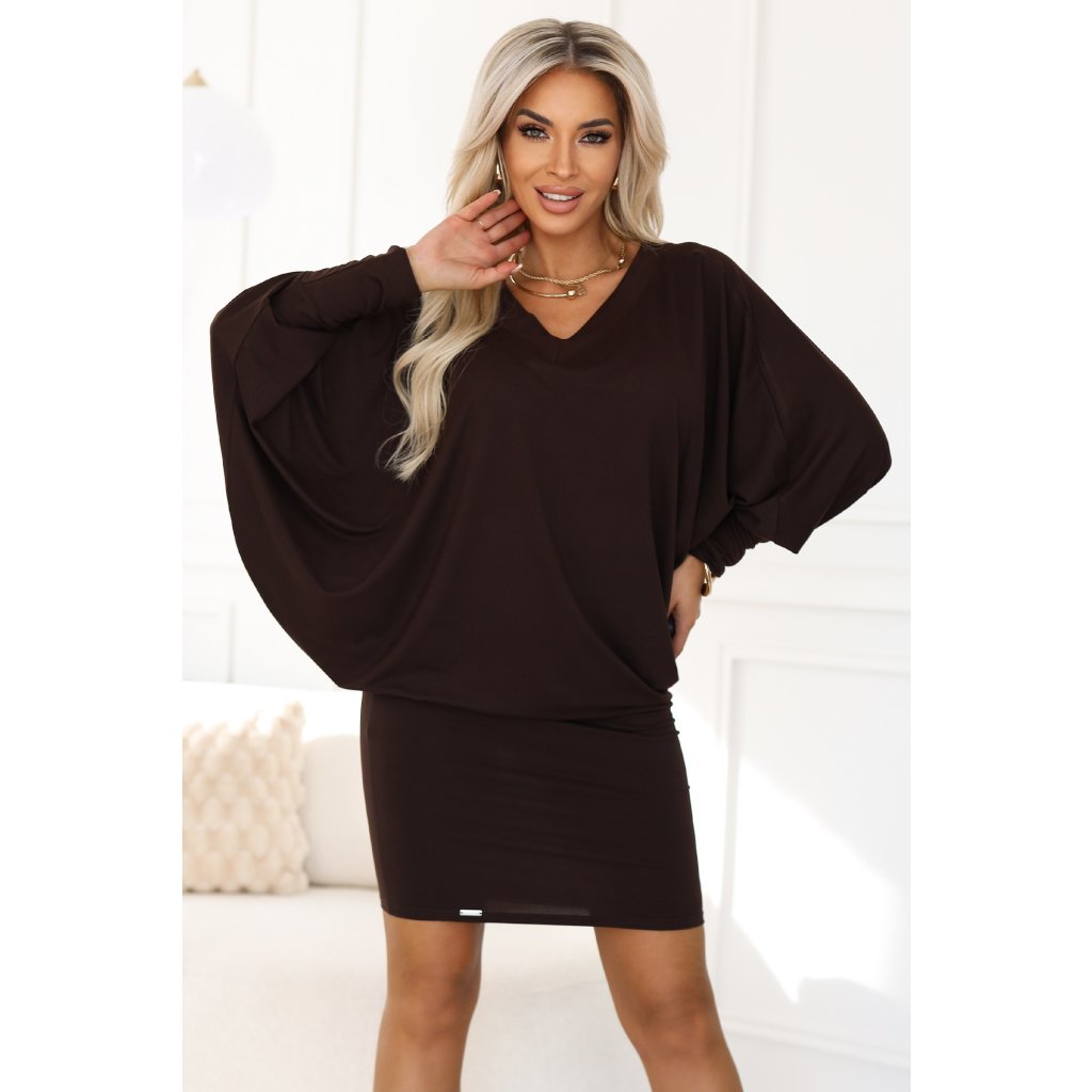 Pohodlné netopierie šaty s dlhým rukávom - čokoládové 402-9