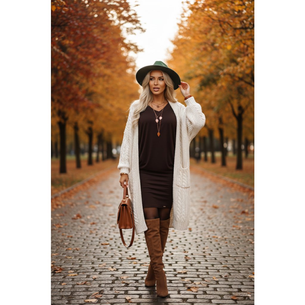 Tieto šaty sú majstrovským spojením trendov a funkčnosti. Zamerali sme sa na voľný, uvoľnený top typu "netopier", ktorý garantuje komfort po celý deň. Kombinovali sme ho s krátkym, formujúcim spodkom, ktorý šikovne predlžuje nohy a modeluje postavu. Hlbokým V dekoltom a vznešenou tmavohnedou (čokoládovou) farbou je zaručené, že budete vyzerať dokonale bez námahy. Ideálne pre ženy, ktoré si cenia kvalitu a chcú sa cítiť pohodlne, pričom zachovávajú štýl.