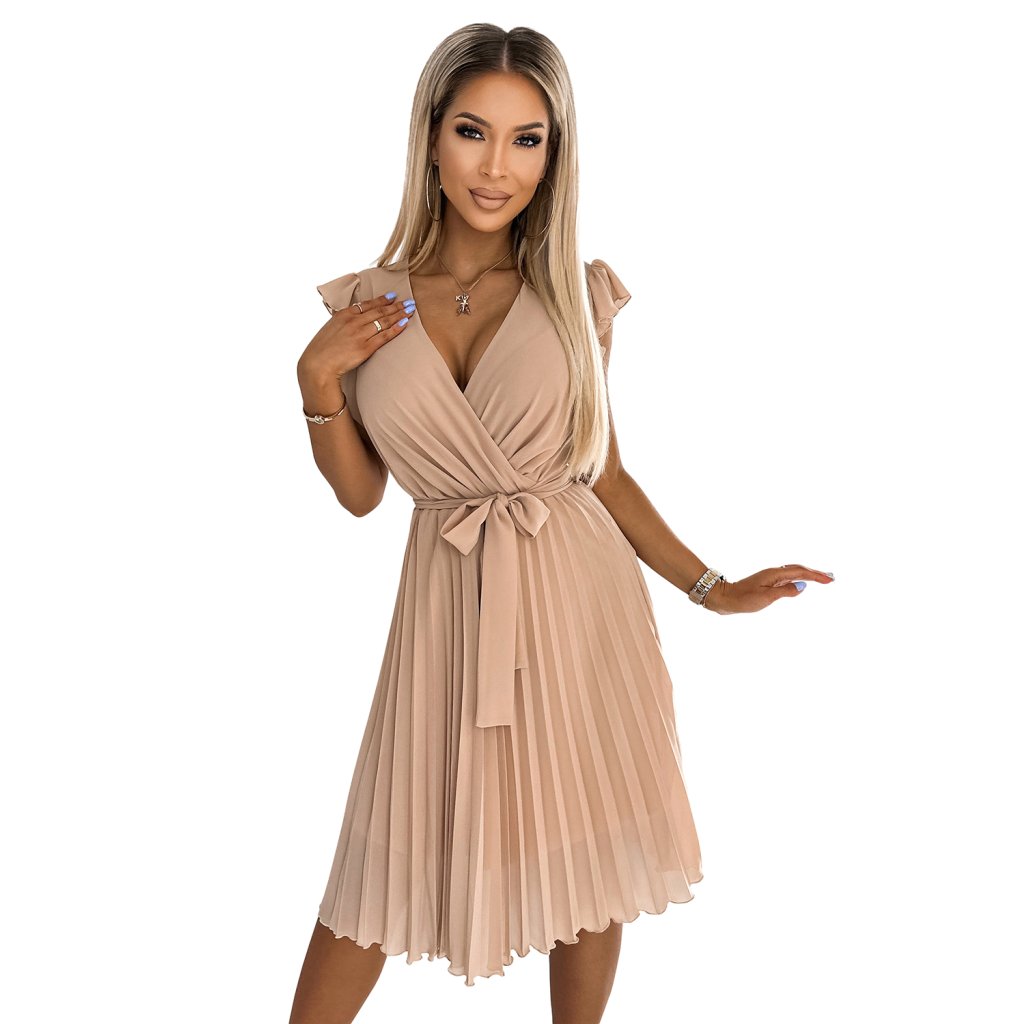 Numoco POLINA Plisované šaty s výstrihom a volánmi - béžové 374-5