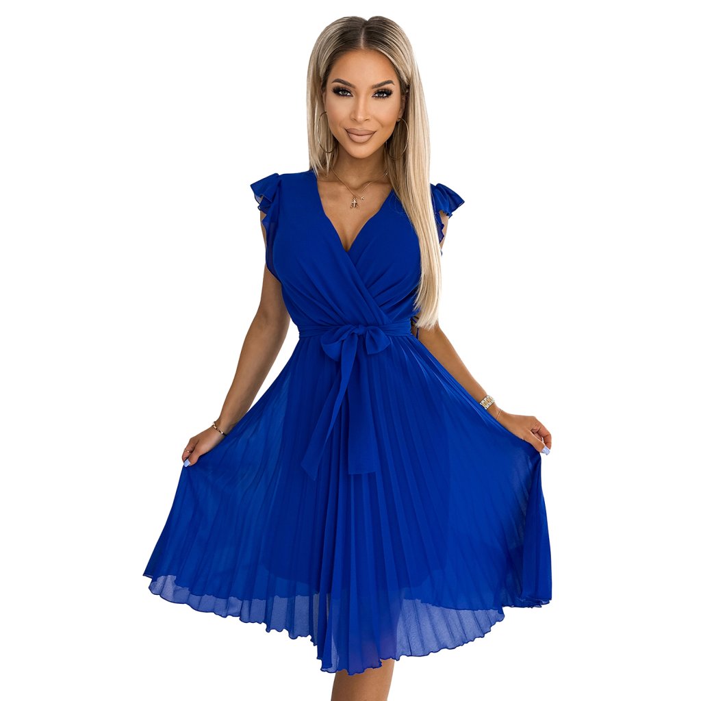 Numoco POLINA Plisované šaty s výstrihom a volánmi - modré 374-4