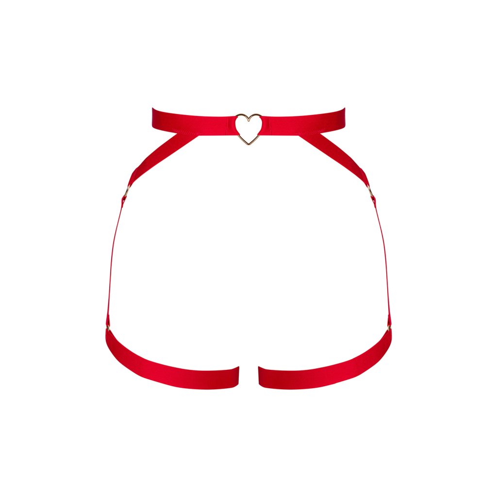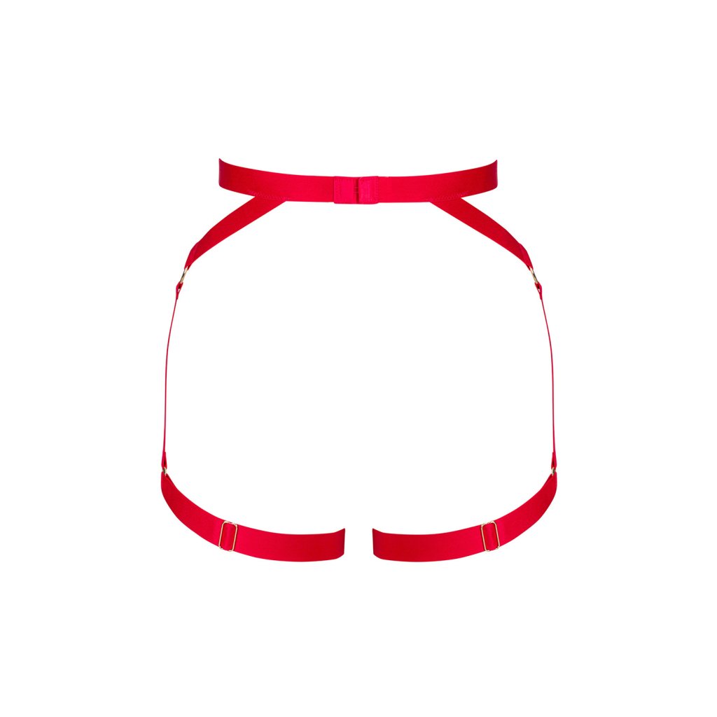 Postroj ELianesObsessive Zvodne zvýrazní pás, boky a stehná Červené ramienka Elianes sú vyrobené zo širokých, mäkkých elastických popruhov s krúžkovými detailmi v zlatej farbe. Bedrový pás s bočnými podväzkovými pásmi a stehenné pásy dokonale zvýrazňujú krivky stredu tela Predný bedrový pás s drahokamovým srdiečkom ako spojkou a nastaviteľným zapínaním na háčik na chrbte. Stehenné popruhy sa dajú tiež nastaviť podľa potreby.