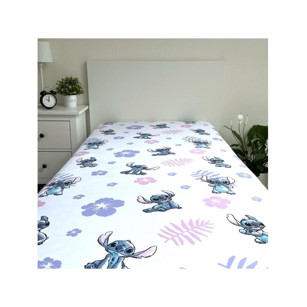 Doprajte deťom pohodlie a hravý štýl s napínacou plachtou „Lilo and Stitch“! Dizajn na bielom podklade zdobia roztomilé postavičky Stitche doplnené fialovými a ružovými kvetmi a tropickými listami. Vzor pôsobí veselým a farebným dojmom, ktorý skvele doplní obliečky s motívom Lilo and Stitch.