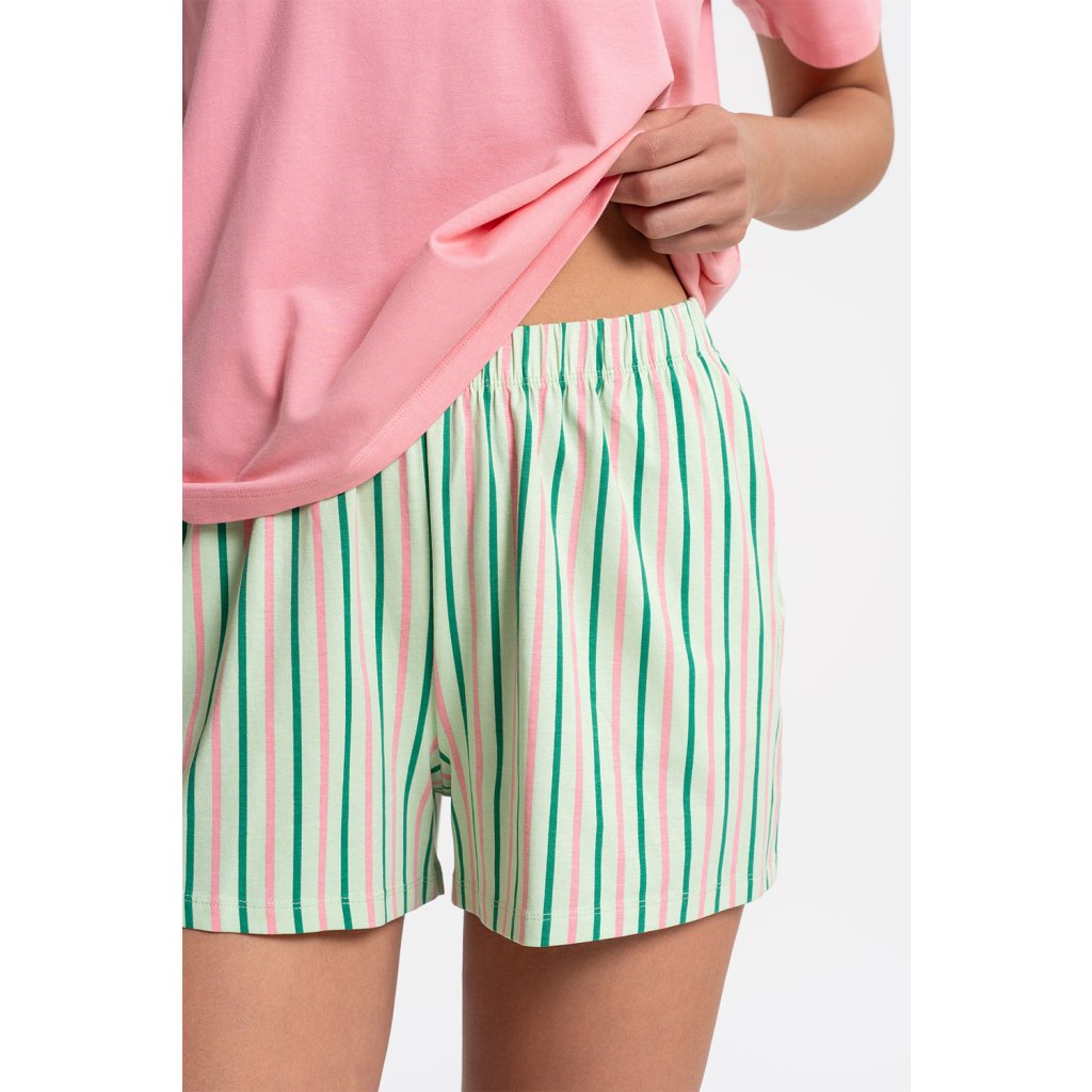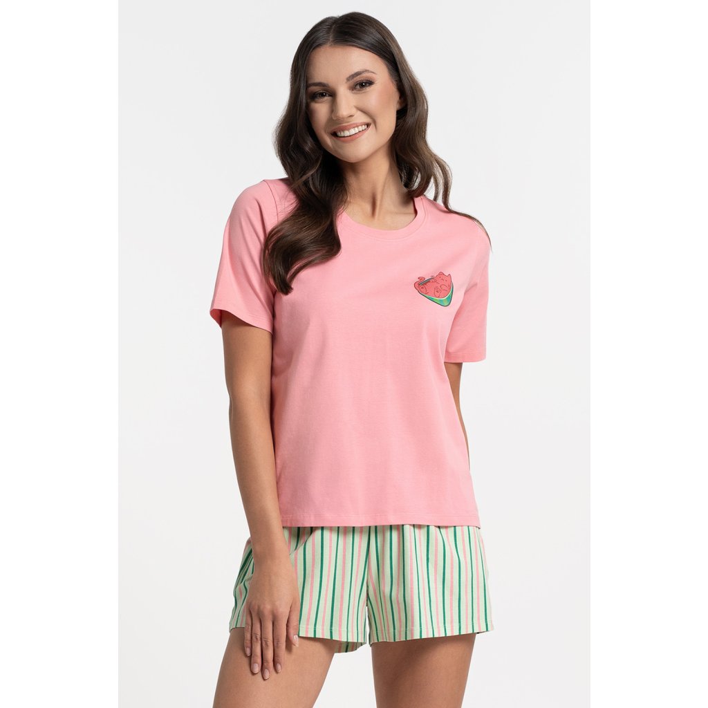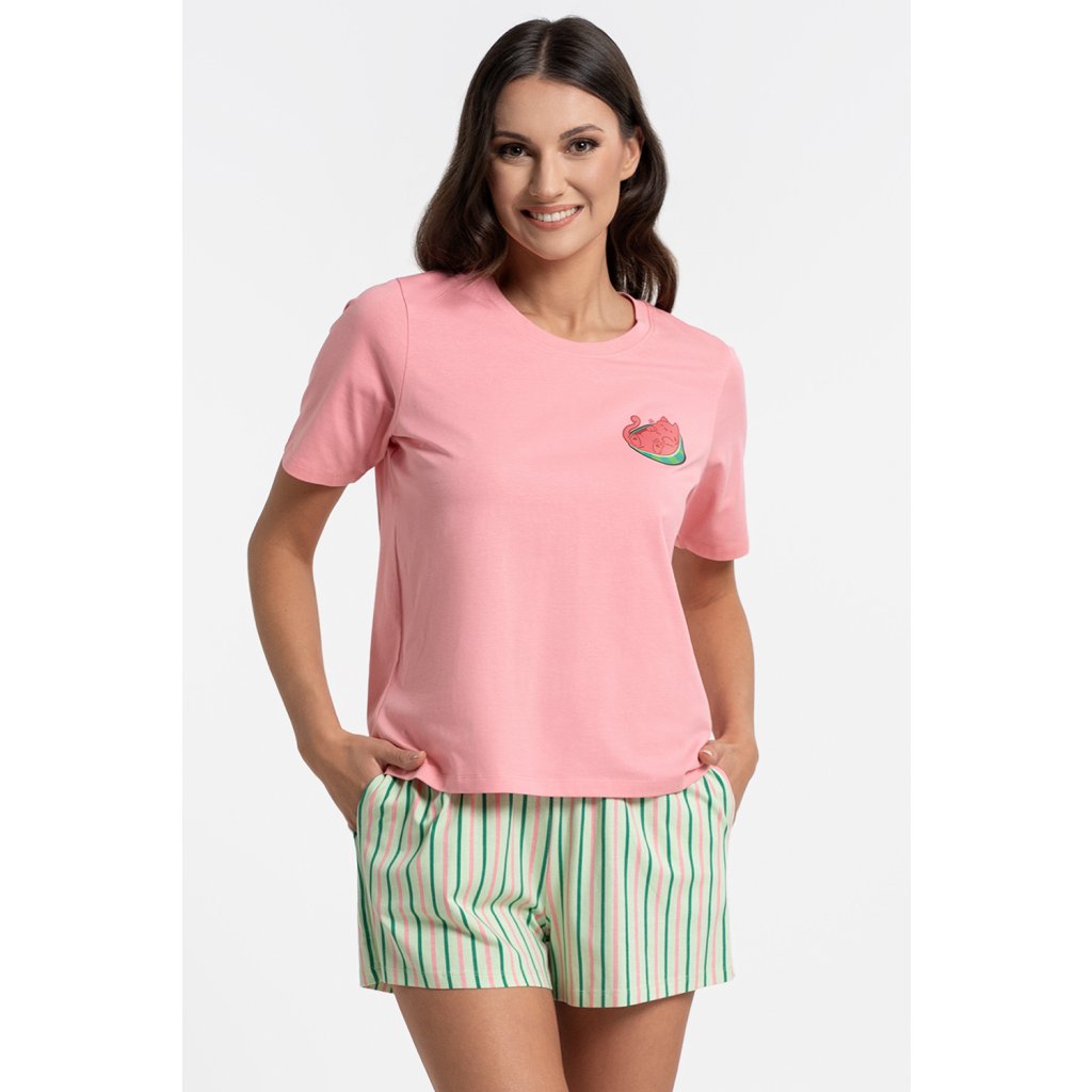 Dámska dvojdielna pyžamová súprava Moraj PDD3200-019 je vyrobená z mäkkého, priedušného bavlneného úpletu s prídavkom elastanu. Tričko s krátkym rukávom a okrúhlym výstrihom umožňuje voľnosť pohybu. Kraťasy majú praktické vrecká pre každodenné pohodlie. Jednoduchý, všestranný strih je ideálny pre teplejšie noci a relaxáciu doma. Zloženie: 95% bavlna, 5% elastan.Dodatočné parametre