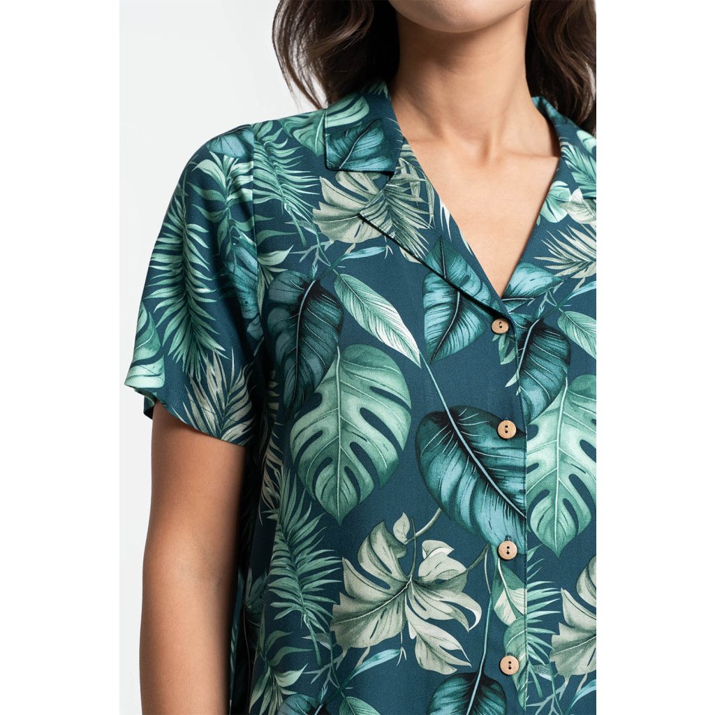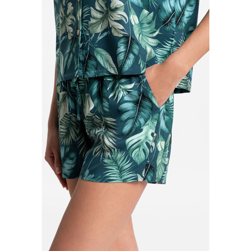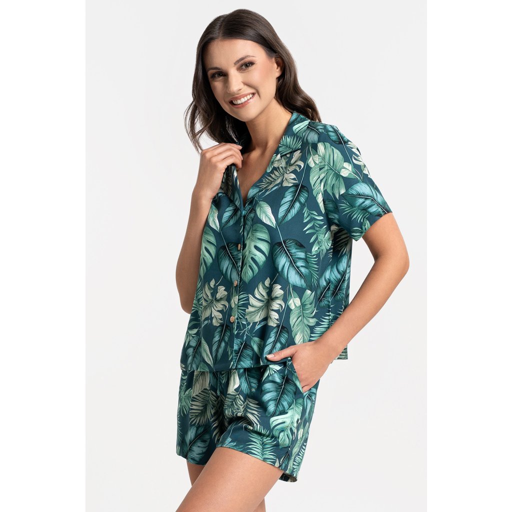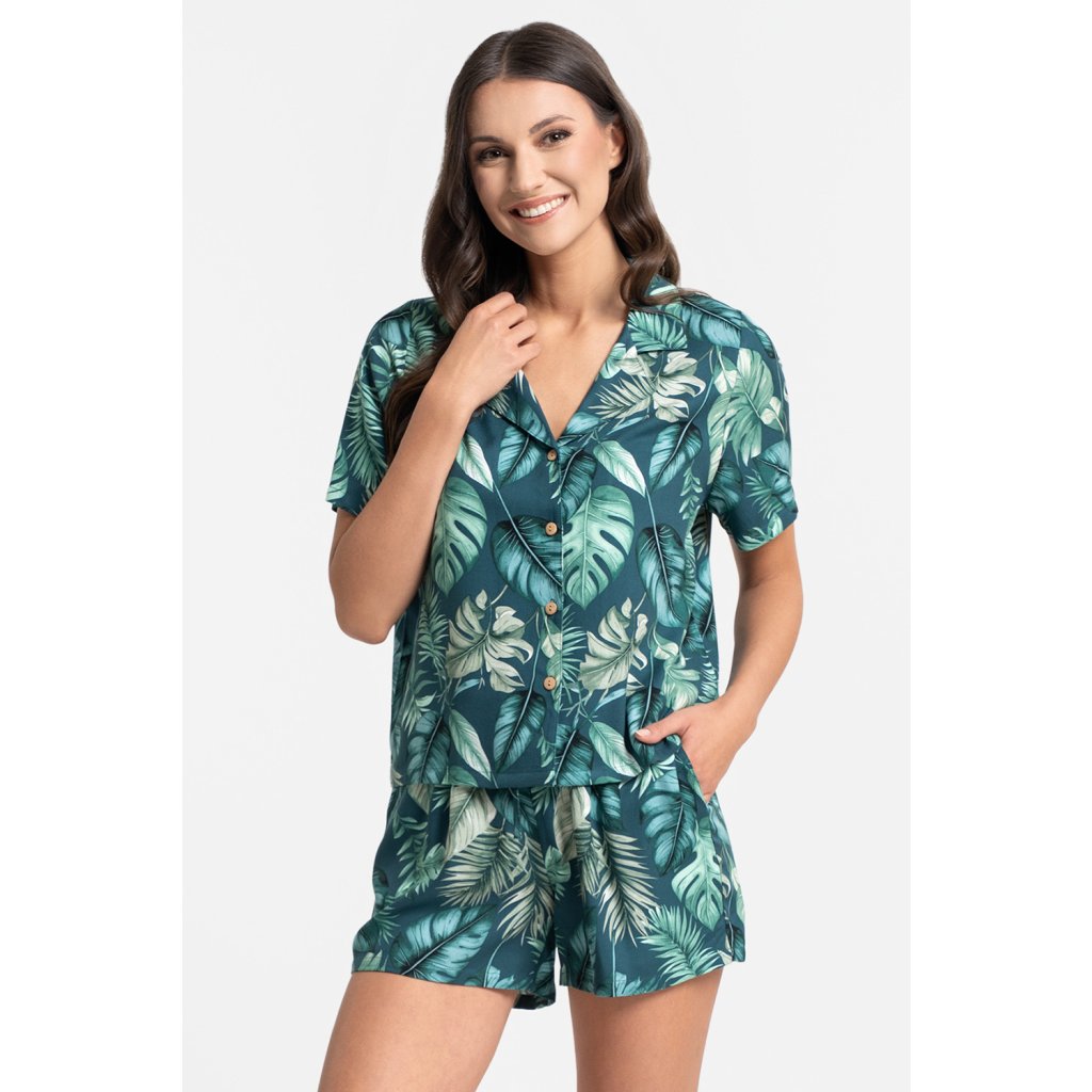 Dámska dvojdielna pyžamová súprava Moraj PDD5100-013 s horným dielom na gombíky a kraťasami. Mäkká viskózová tkanina zaisťuje pohodlie a priedušnosť. Elastický pás a vrecká v kraťasoch zvyšujú funkčnosť súpravy. Krátke rukávy a krátke nohavice sú ideálne pre teplejšie noci a každodennú relaxáciu doma. Zloženie: 100% viskóza.Dodatočné parametre