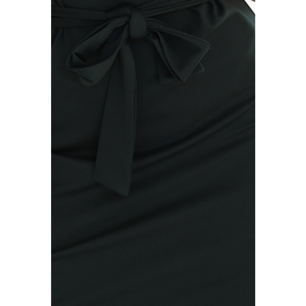 Elegantné šaty v tmavo khaki farbe s krátkymi rukávmi a zaväzovaním v páse. Vyrobené z elastického materiálu, perfektne sa prispôsobia postave. Poľský výrobok - značka Numoco.