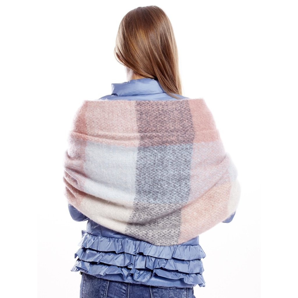 Široký ružovo-svetlo modrý kockovaný šál s brmbolcami