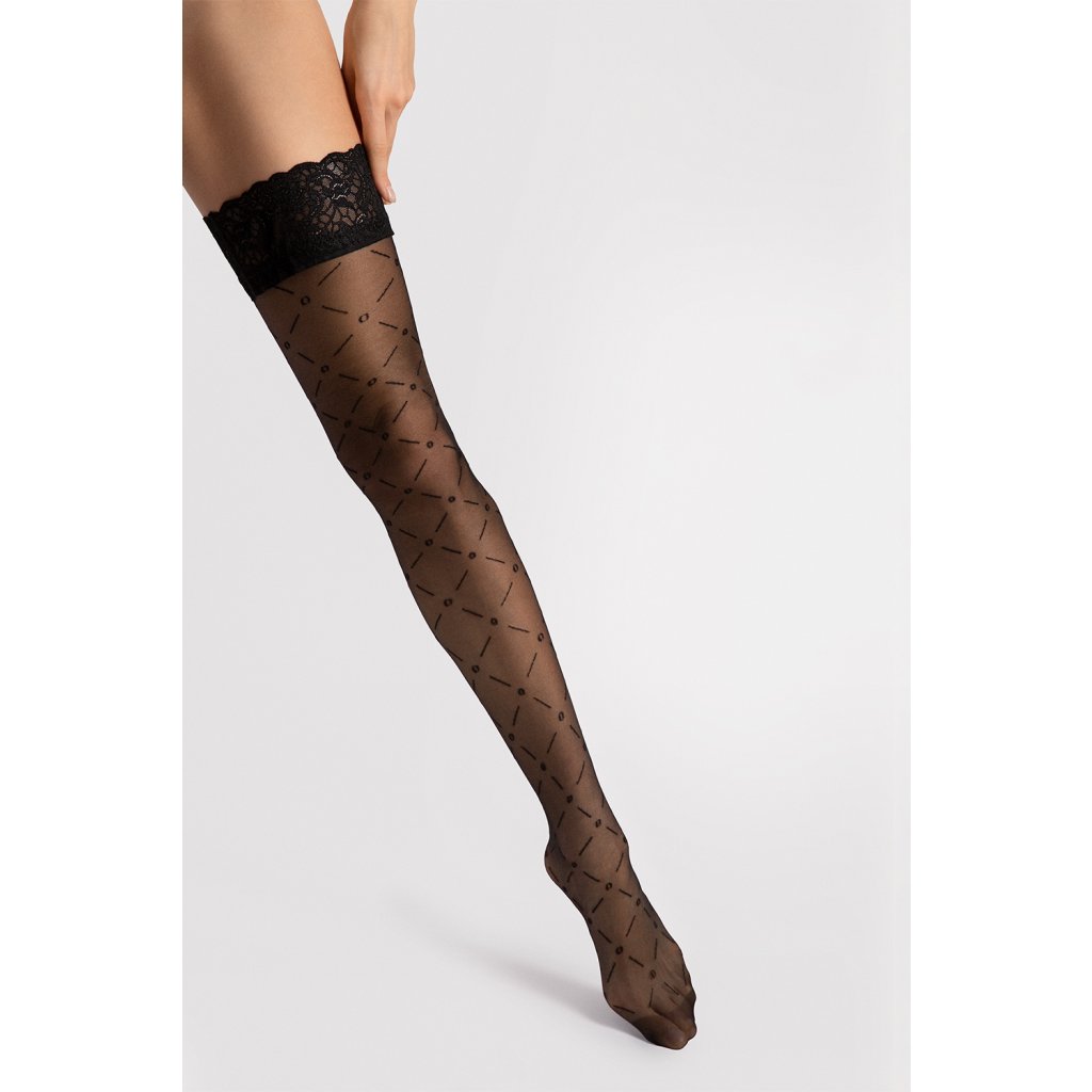 Mat20 denier, polomatná grafická bodová mriežka, elastická čipka so silikónovými prúžkami v hornej časti, viditeľne vystužená, hladké prsty Materiál: Polyamid