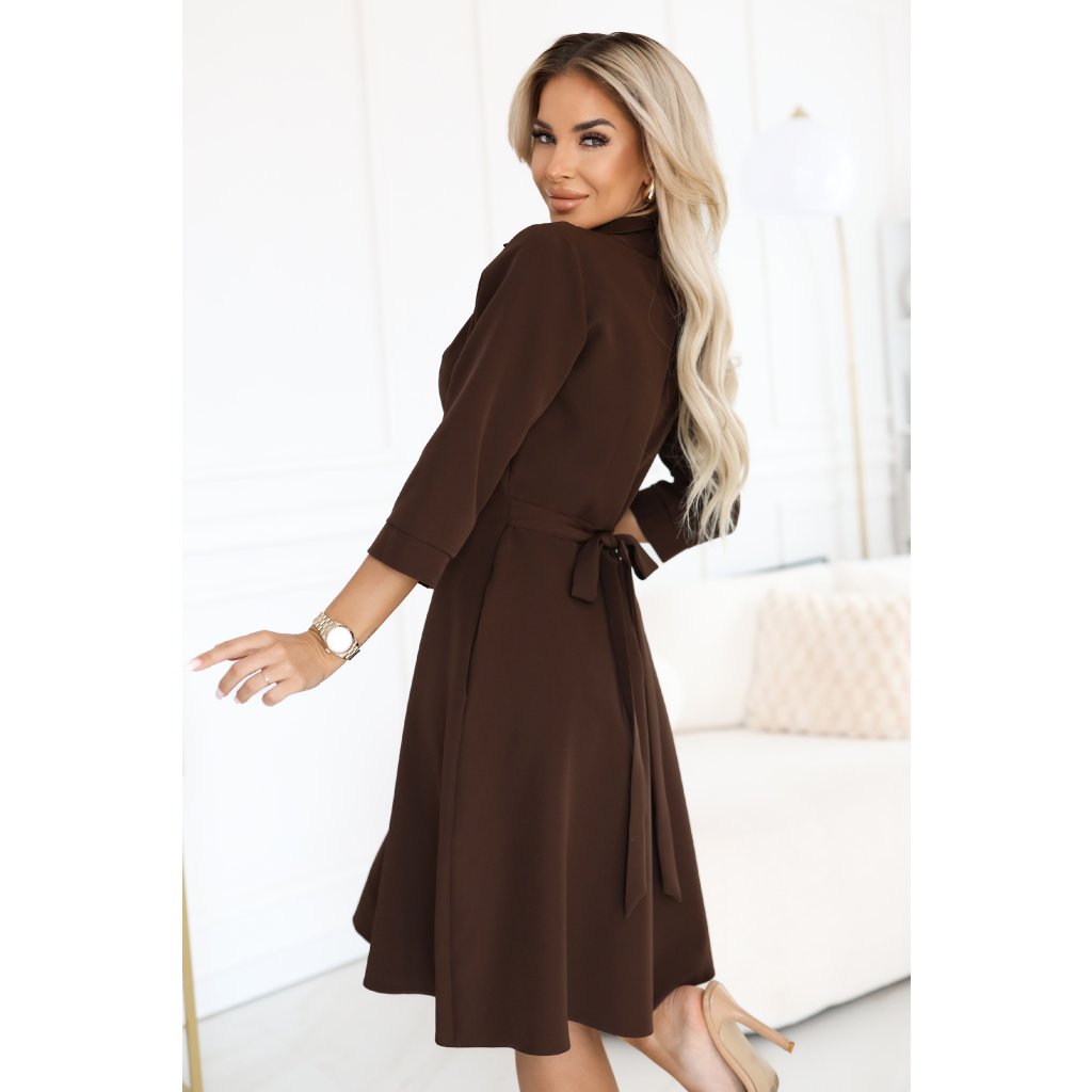 čokoládové košeľové šaty, hnedé košeľové šaty, elegantné midi šaty, košeľové šaty s viazaním, šaty do práce Numoco, poľský výrobca šiat