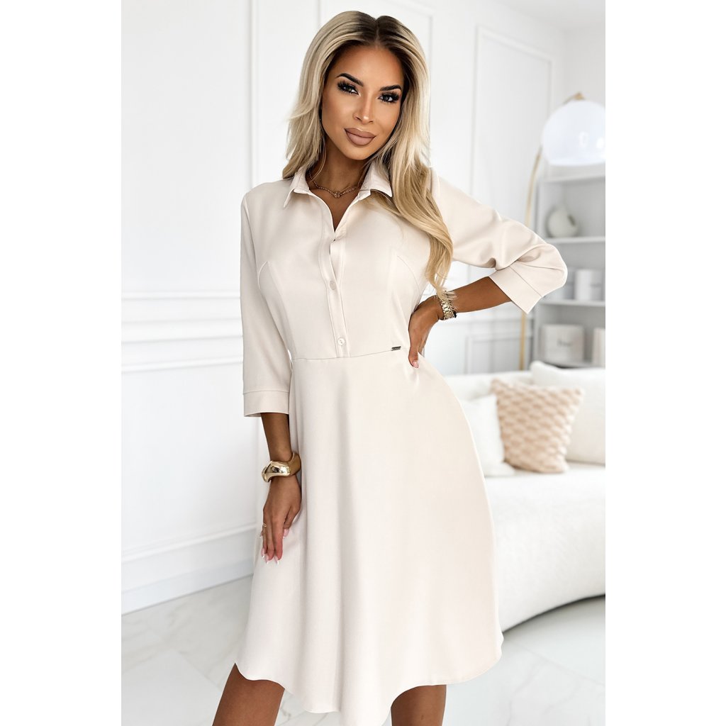 SANDY Rozviate košeľové šaty s opaskom. Vyrobené z materiálu príjemného na dotyk (95% polyester, 5% elastan) v béžovej farbe. Značka numoco. Poľský výrobok.
