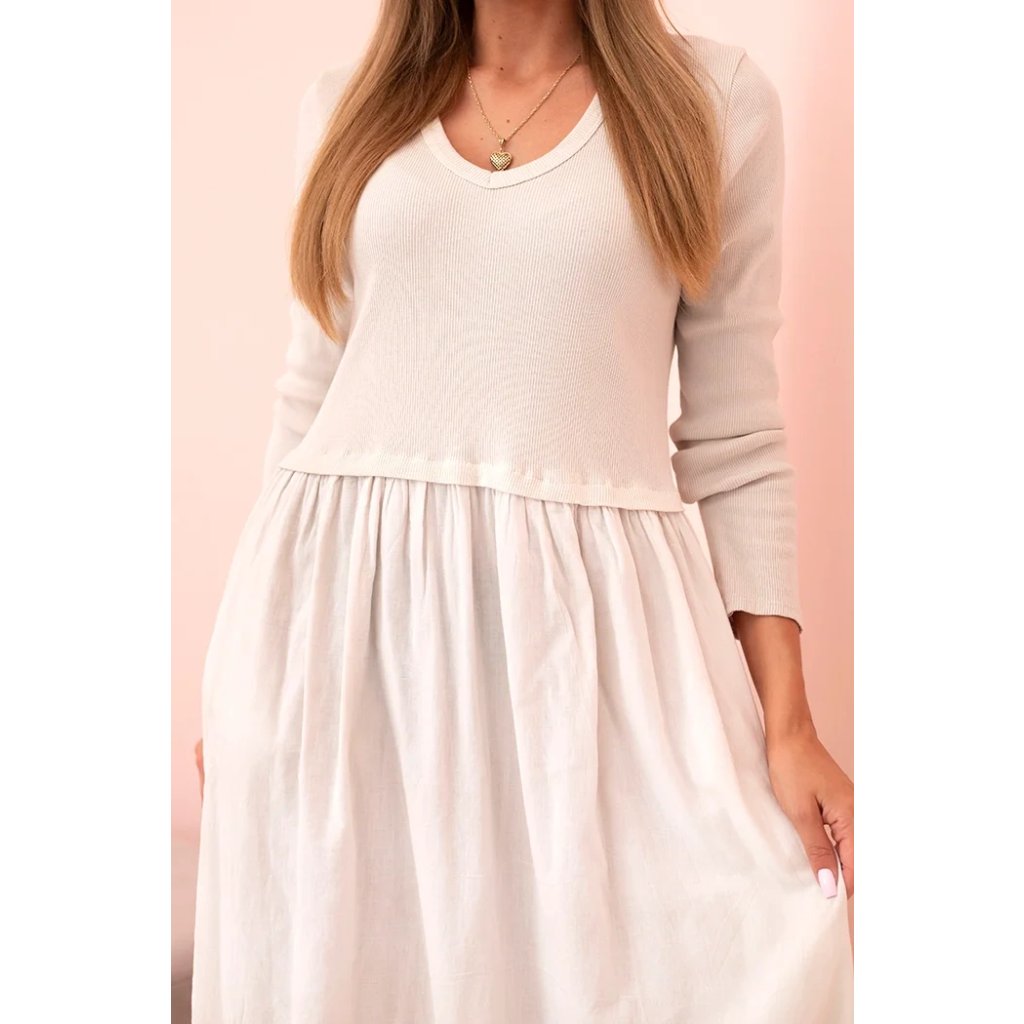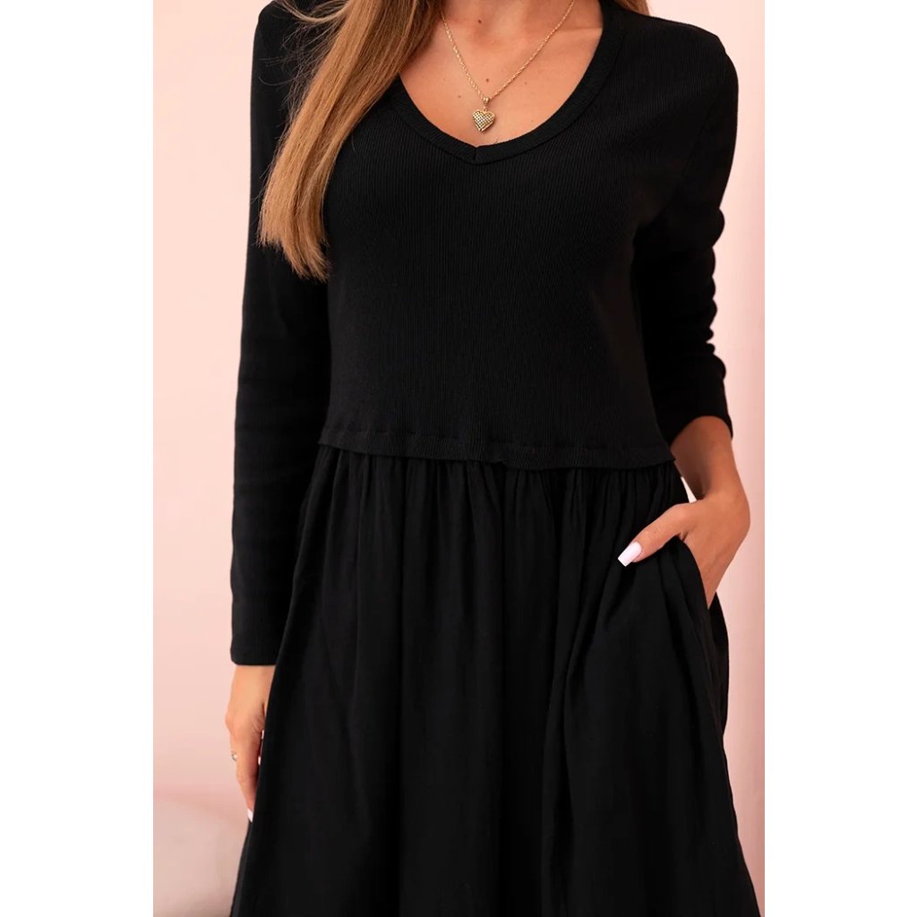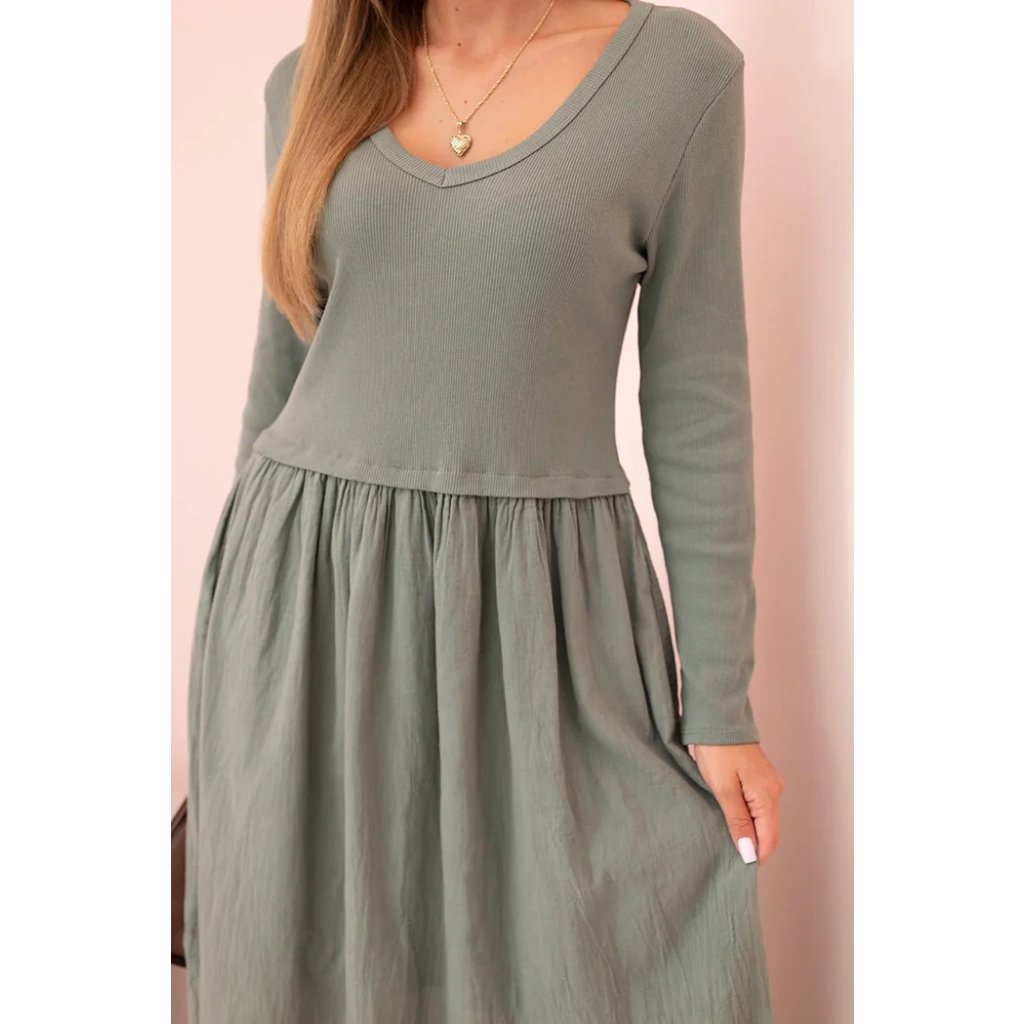 Ľahké dámske šaty ušité z príjemnej na dotyk bavlnenej pleteniny, ktorá sa krásne prispôsobí postave. Horná časť z rebrovaného materiálu zvýrazňuje ženskú líniu, zatiaľ čo spodná časť s mierne nariaseným zakončením dodáva ľahkosť. Hlboký V výstrih opticky predlžuje krk a dlhý rukáv zaisťuje pohodlie v chladnejších dňoch.