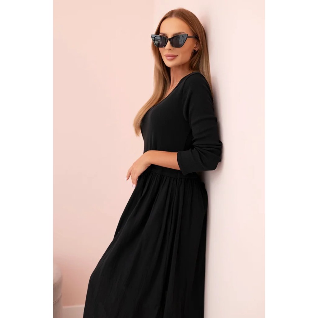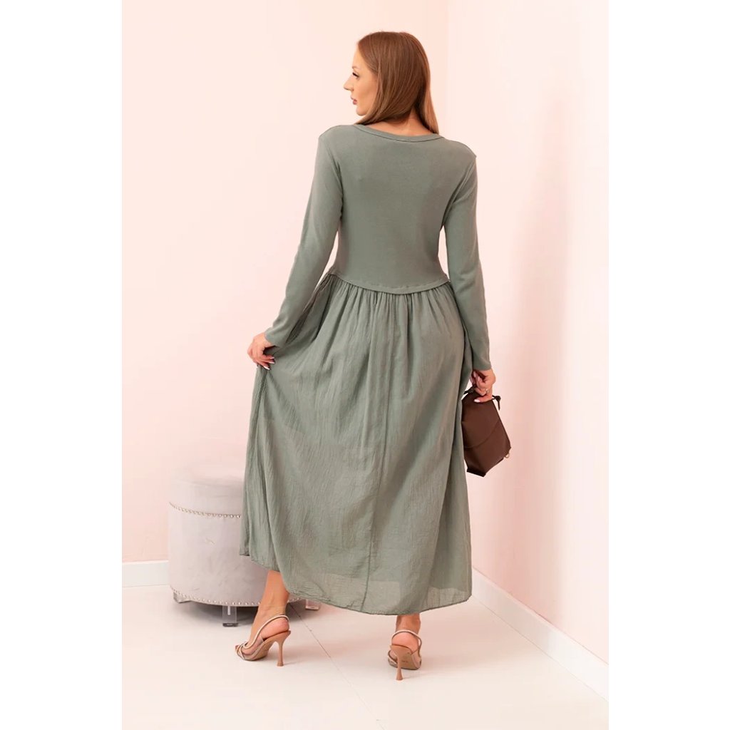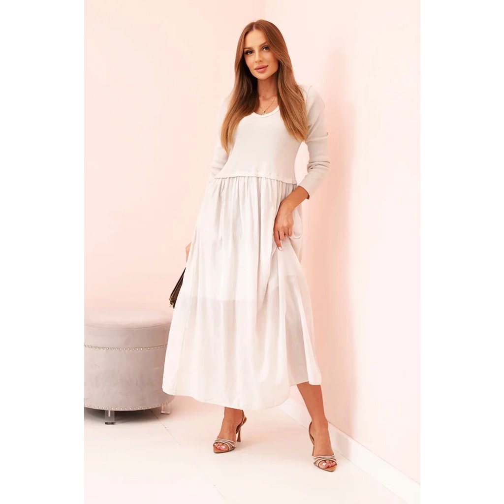 Ľahké dámske šaty ušité z príjemnej na dotyk bavlnenej pleteniny, ktorá sa krásne prispôsobí postave. Horná časť z rebrovaného materiálu zvýrazňuje ženskú líniu, zatiaľ čo spodná časť s mierne nariaseným zakončením dodáva ľahkosť. Hlboký V výstrih opticky predlžuje krk a dlhý rukáv zaisťuje pohodlie v chladnejších dňoch.