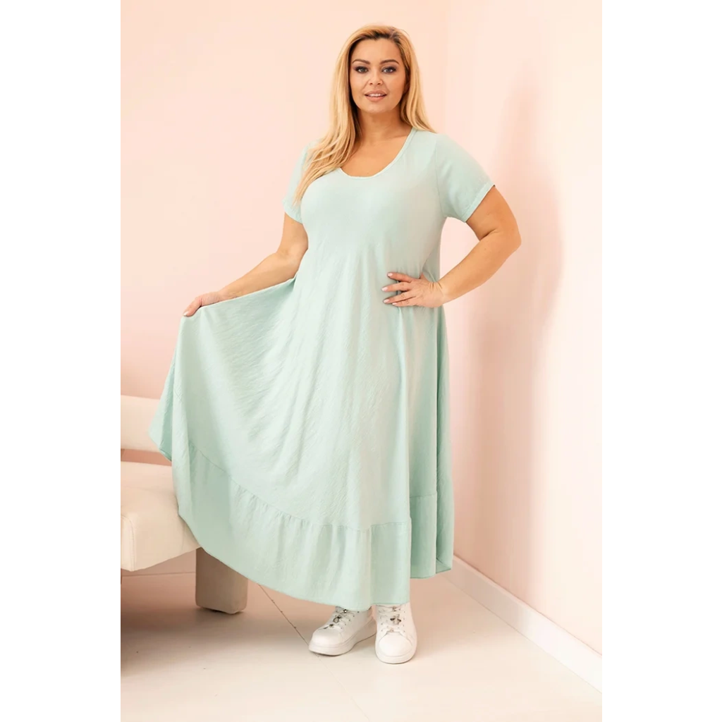 Dámske šaty nadmernej veľkosti sú ideálnou voľbou pre ženy, ktoré si cenia pohodlie, voľnosť pohybu a ženský štýl. Model je vyrobený z kvalitnej viskózy, ktorá je ľahká, priedušná a príjemná na pokožke - ideálna najmä na leto. Voľný, rozšírený strih s ozdobným volánom v spodnej časti sa krásne prispôsobí postave, zakryje všetky nedokonalosti a zvýrazní ženské tvary. Krátke rukávy a výstrih do V dodávajú ľahkosť a opticky zoštíhľujú hornú časť tela. Ideálne šaty na každodenné nosenie, prechádzky, dovolenku alebo neformálne stretnutia.