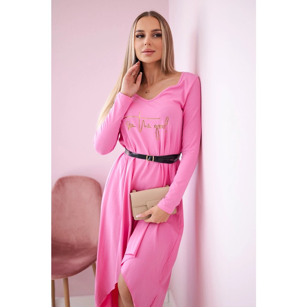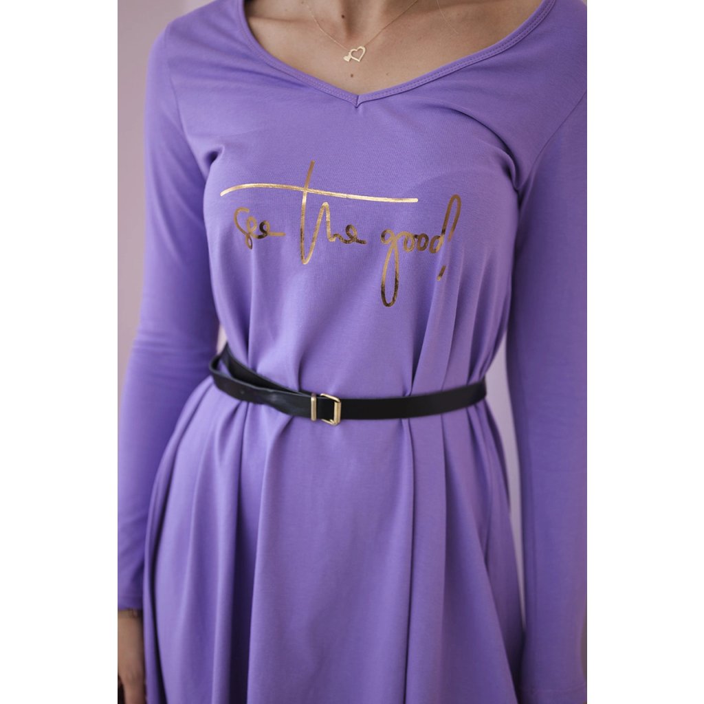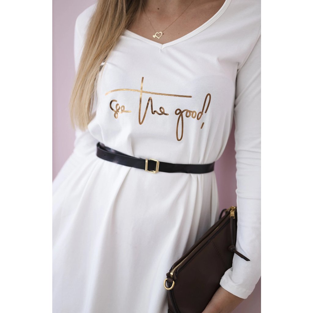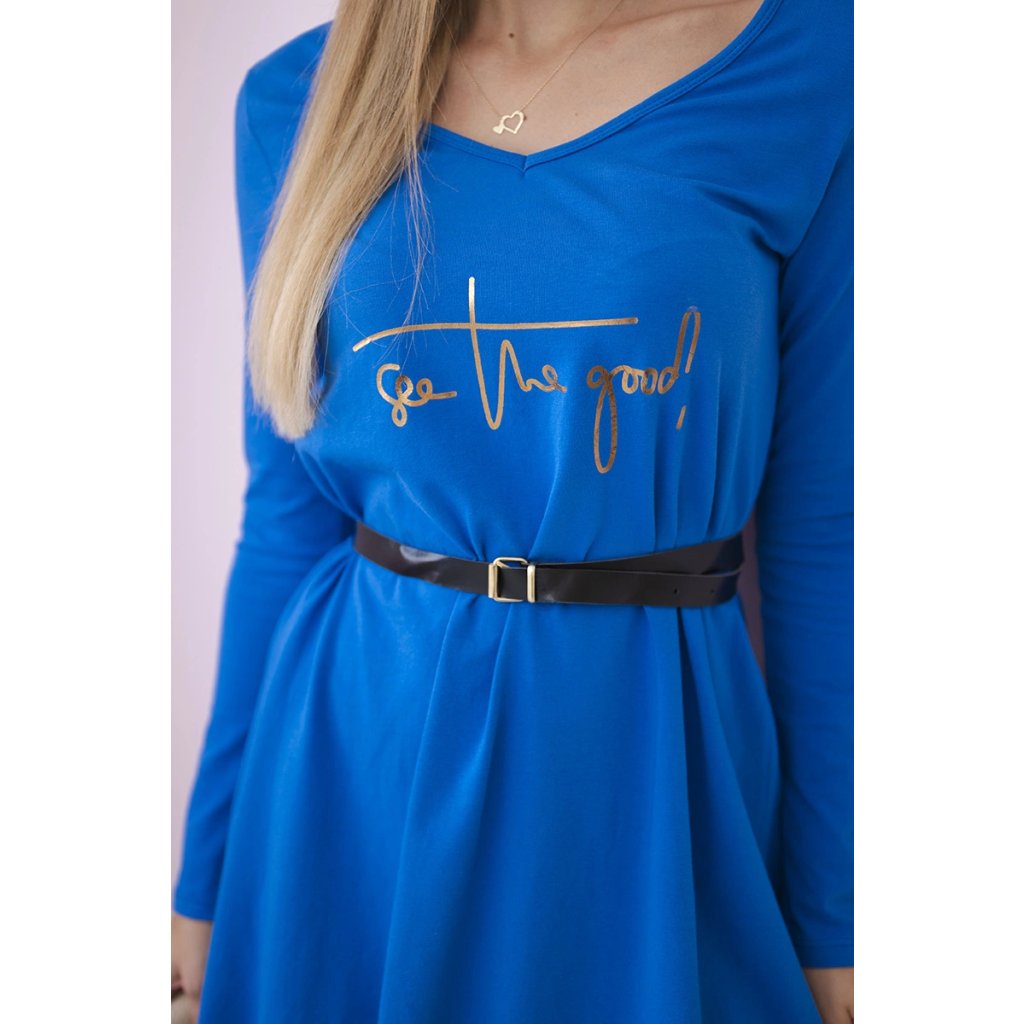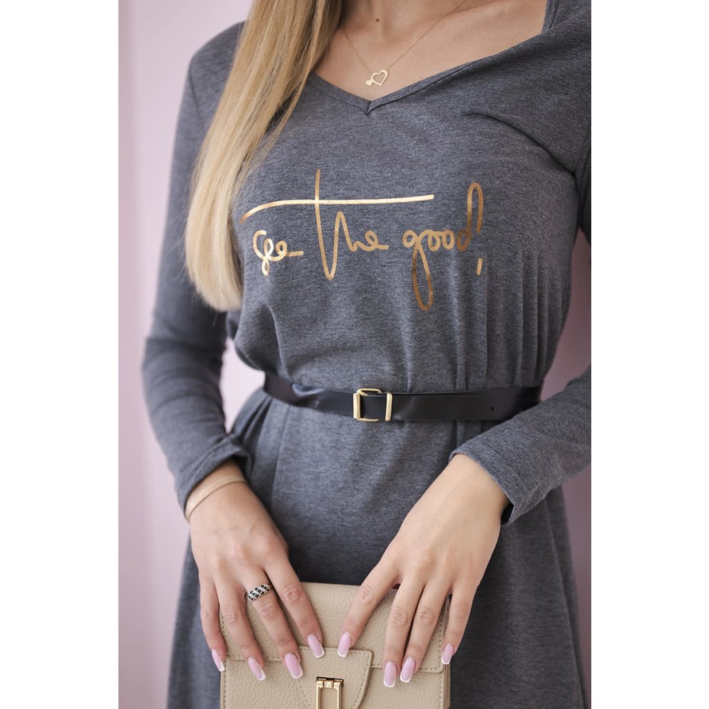 Predstavujeme vám pohodlné šaty s ozdobným opaskom a módnym nápisom na prednej strane. Šaty majú dlhší chrbát. Šaty sú vyrobené z kvalitného materiálu. Veľmi zaujímavá ponuka pre všetky dámy. Veľkosť je univerzálna a vyhovuje dámam, ktoré nosia veľkosť S, M alebo L.