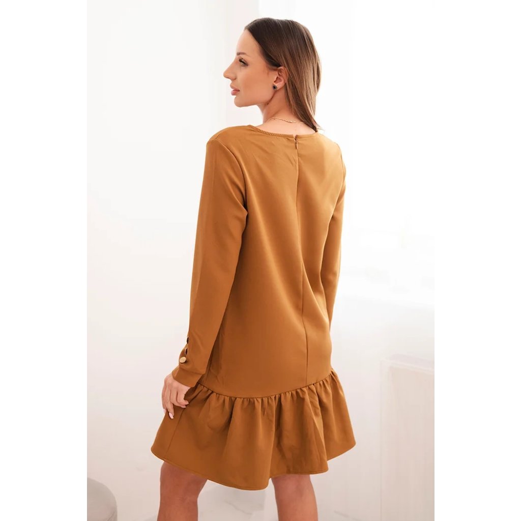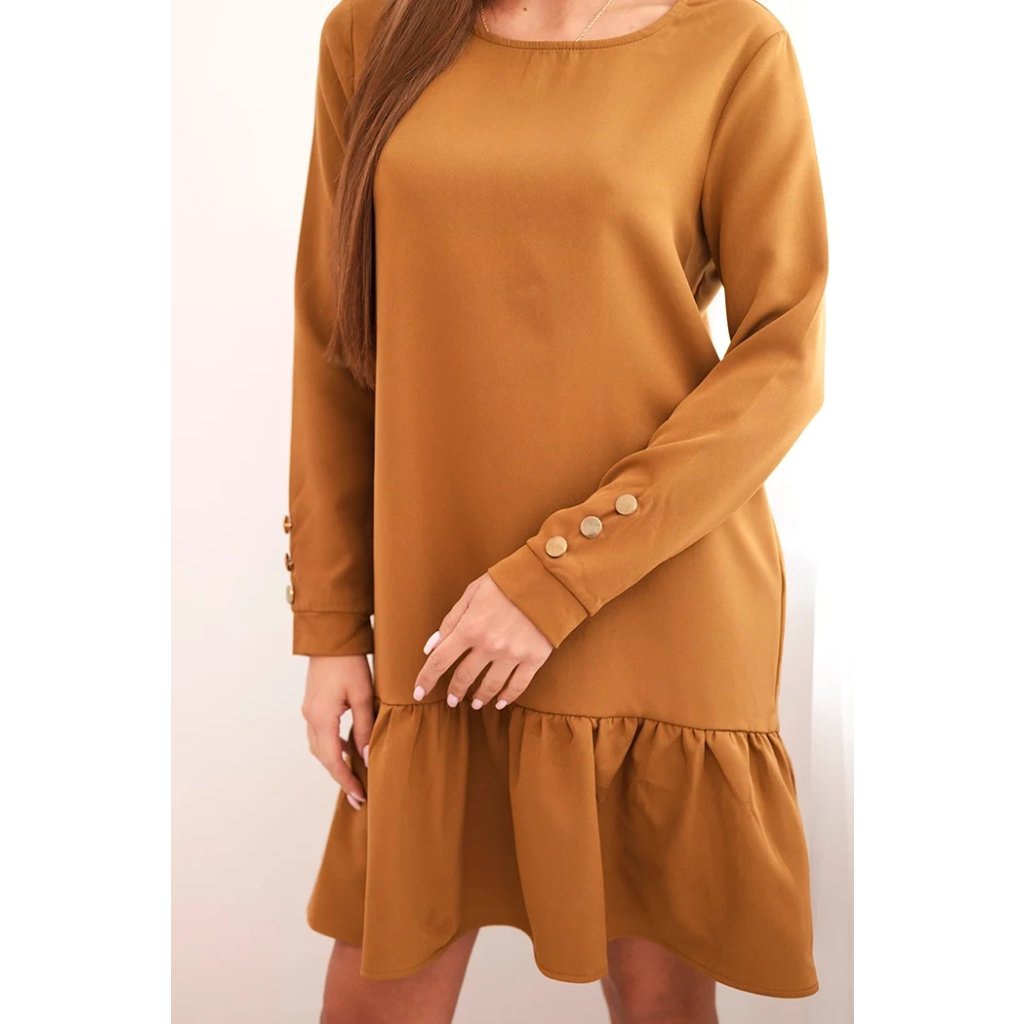 Predstavujeme vám elegantné šaty. Šaty s volánom. Šaty s dlhými rukávmi a ozdobnými zlatými gombíkmi na rukávoch. Šaty sú vyrobené z kvalitného materiálu. Veľkosť je univerzálna a vyhovuje dámam, ktoré nosia veľkosť S, M alebo L.
