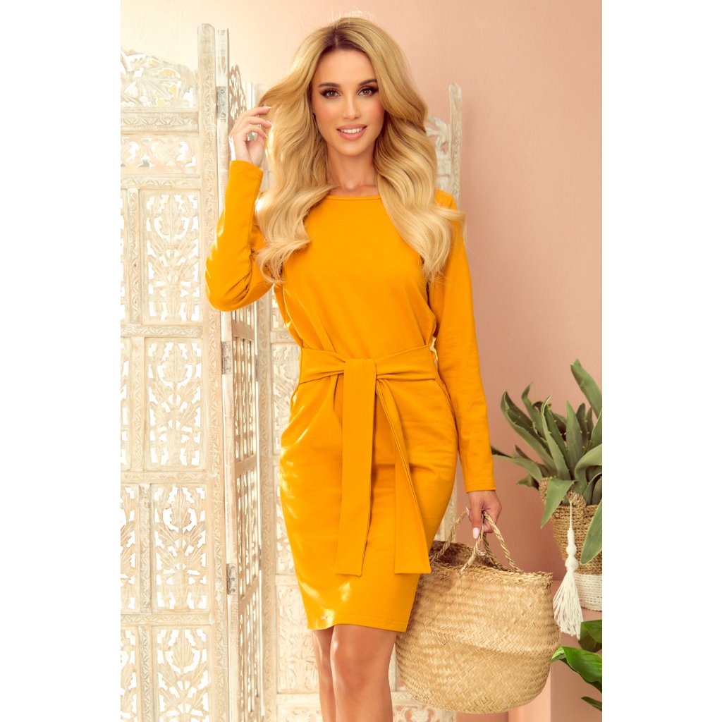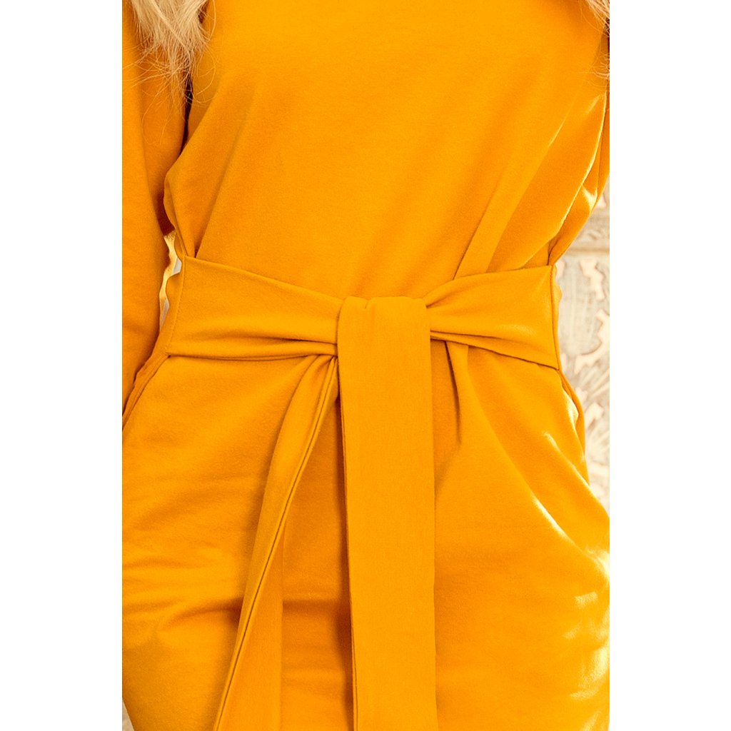 Šaty so širokým opaskom - možno ho viazať ako vpredu, tak vzadu. Príjemná na dotyk - Horčicová farba. Značka numoco. Poľská produkcia.