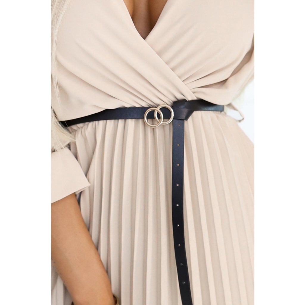 Elegantné skladané šaty v tmavobéžovej farbe s zavinovacím výstrihom a čiernym opaskom. Ideálne pre zvláštne príležitosti aj každodenné použitie. Základná značka Numoco. Európska produkcia.