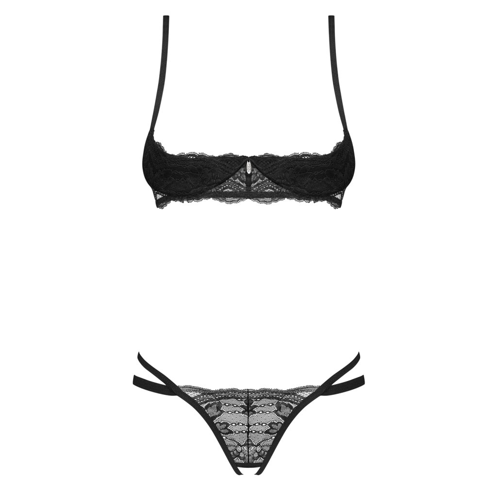 Oslávte svoju krásu v luxusnej spodnej bielizni! Pokiaľ si vyberiete túto prekrásnu sadu otvorenej podprsenky a otvorených táng z kolekcie Nutris od luxusnej značky Obsessive, môžete sa tešiť na sofistikovanú a erotickú prepracovanú čipku. Je to majstrovské dielo s podmanivým botanickým motívom, ktoré podčiarkne vašu zvodnosť a sebavedomie.- čierna podprsenka s otvorenými košíčkami a tangá s otvoreným rozkrokom