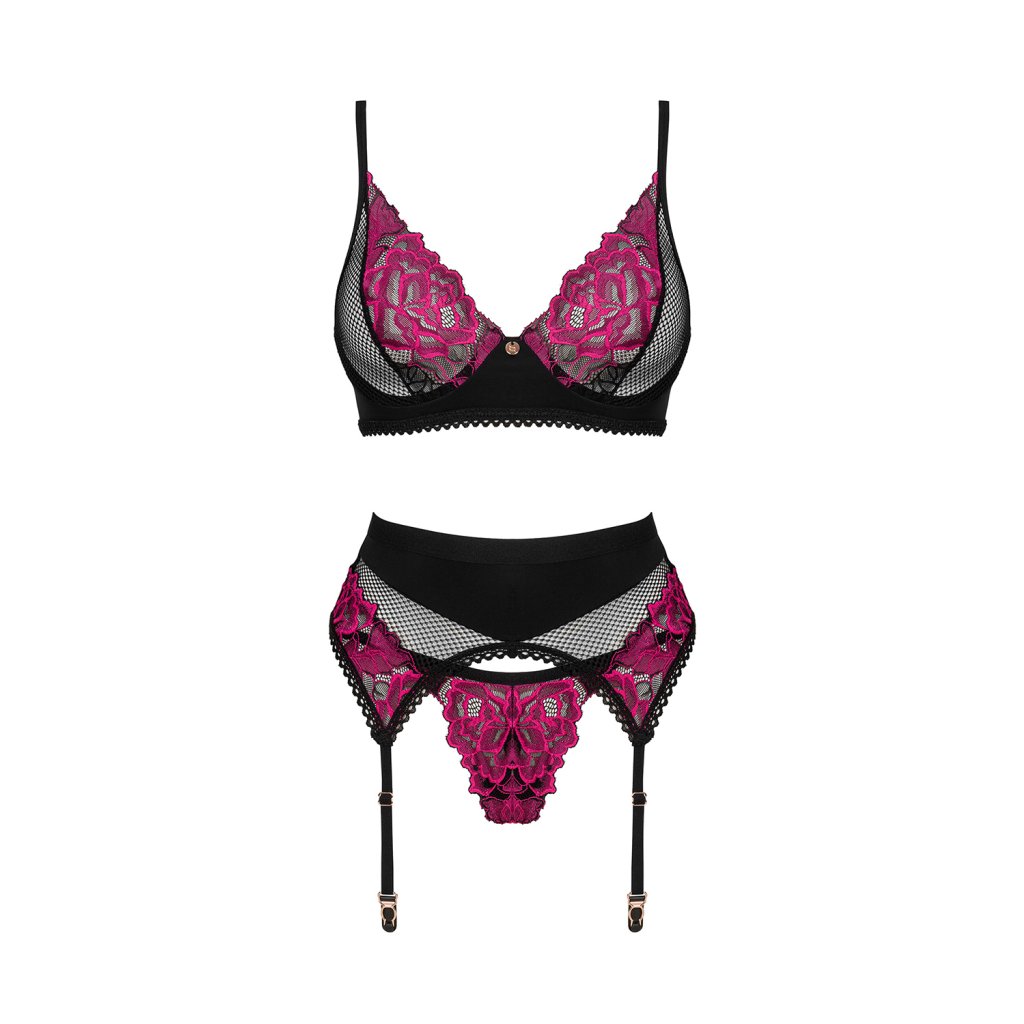 Trojdielna súprava Rosenta oplývajúca sexepílom Nechajte na svojom tele rozkvitnúť ruže v podobe podmanivých výšiviek, ktoré dokonale ladia s čiernou farbou. Hľadajte podprsenku, ktorá atraktívne zvýrazní poprsie, elegantný podväzkový pás a tangá, ktoré krásne odhalia zadok. Nebojte sa riskovať a určite očaríte nielen seba. Objavte jeho tajomstvo: - trojdielny set Rosenty - obsahuje podprsenku, podväzkový pás a tangá - nastaviteľné ramienka, podväzkový pás a viacstupňové zapínanie - záruka dokonalého prispôsobenia - kostice v košíčkoch - krásne zvýrazňujú prsia - lesklé ružovo-zlaté doplnky - pútavé detaily - motív ruže &ndash zaujímavý dizajn - elastický materiál &ndash záruka pohodlia Zloženie: 90% polyamid, 10% elastanDodatočné parametre