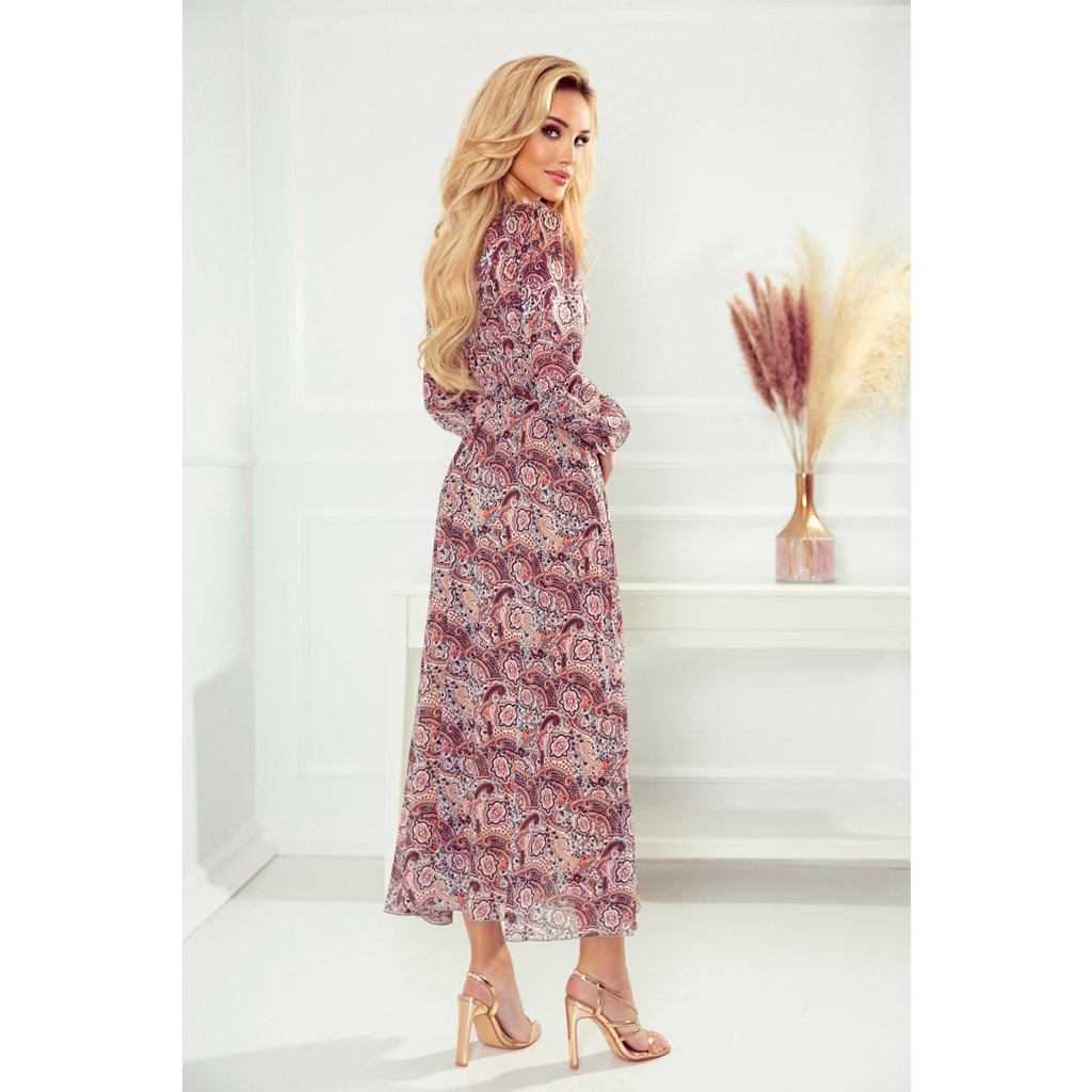 Šifónové midi šaty s výstrihom. Vzor: hnedé boho. Poľská výroba. Značka Numoco.
