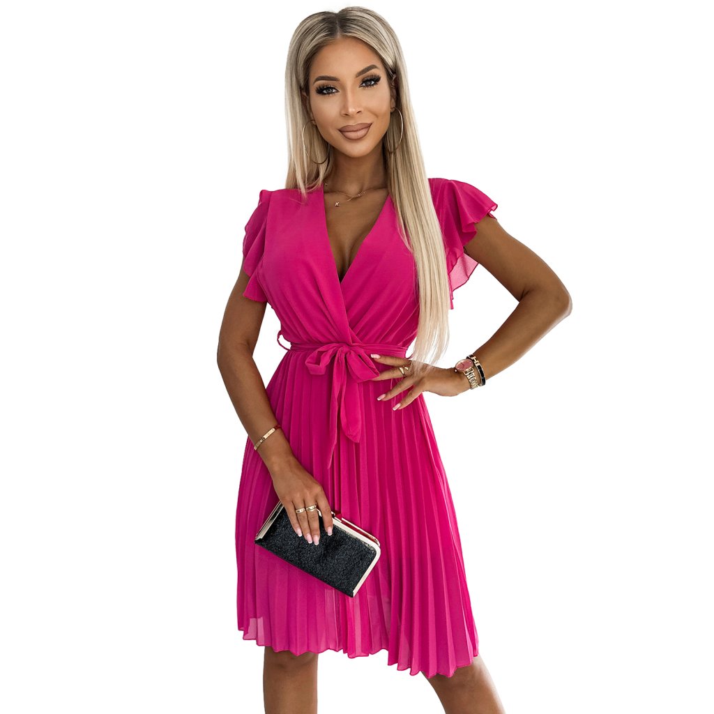 Šifónové riasené šaty s výstrihom a volánmi - ružová barbie farba 424-2 - výpredaj