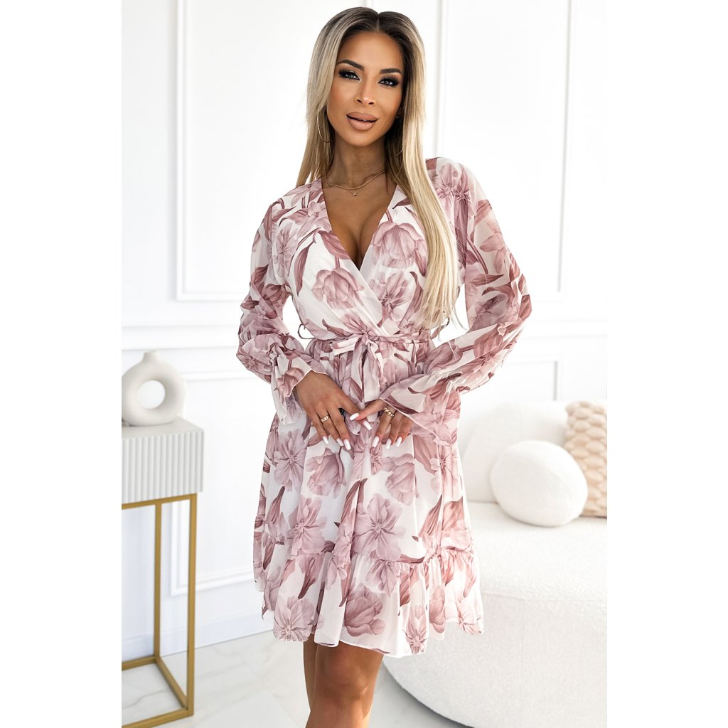 Šifónové šaty s výstrihom, volánmi a opaskom - béžové kvety 514-1