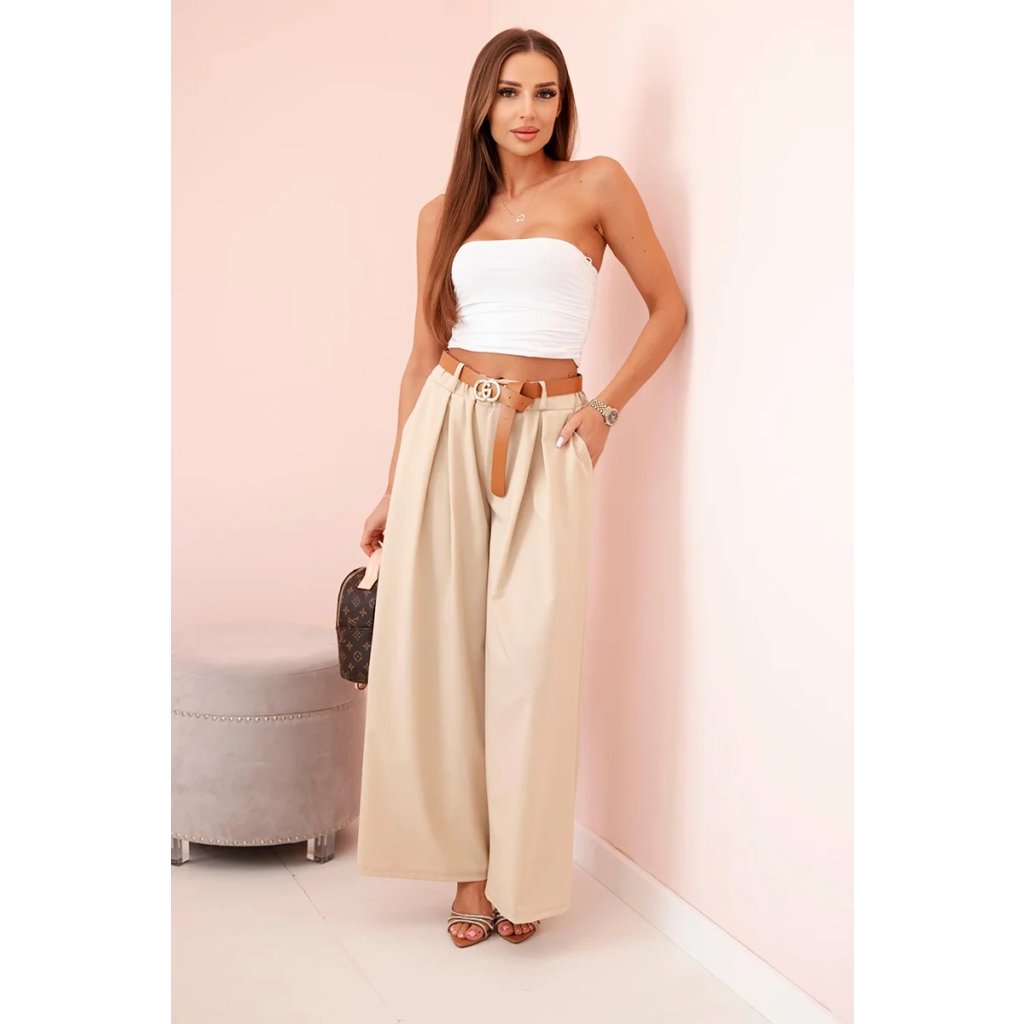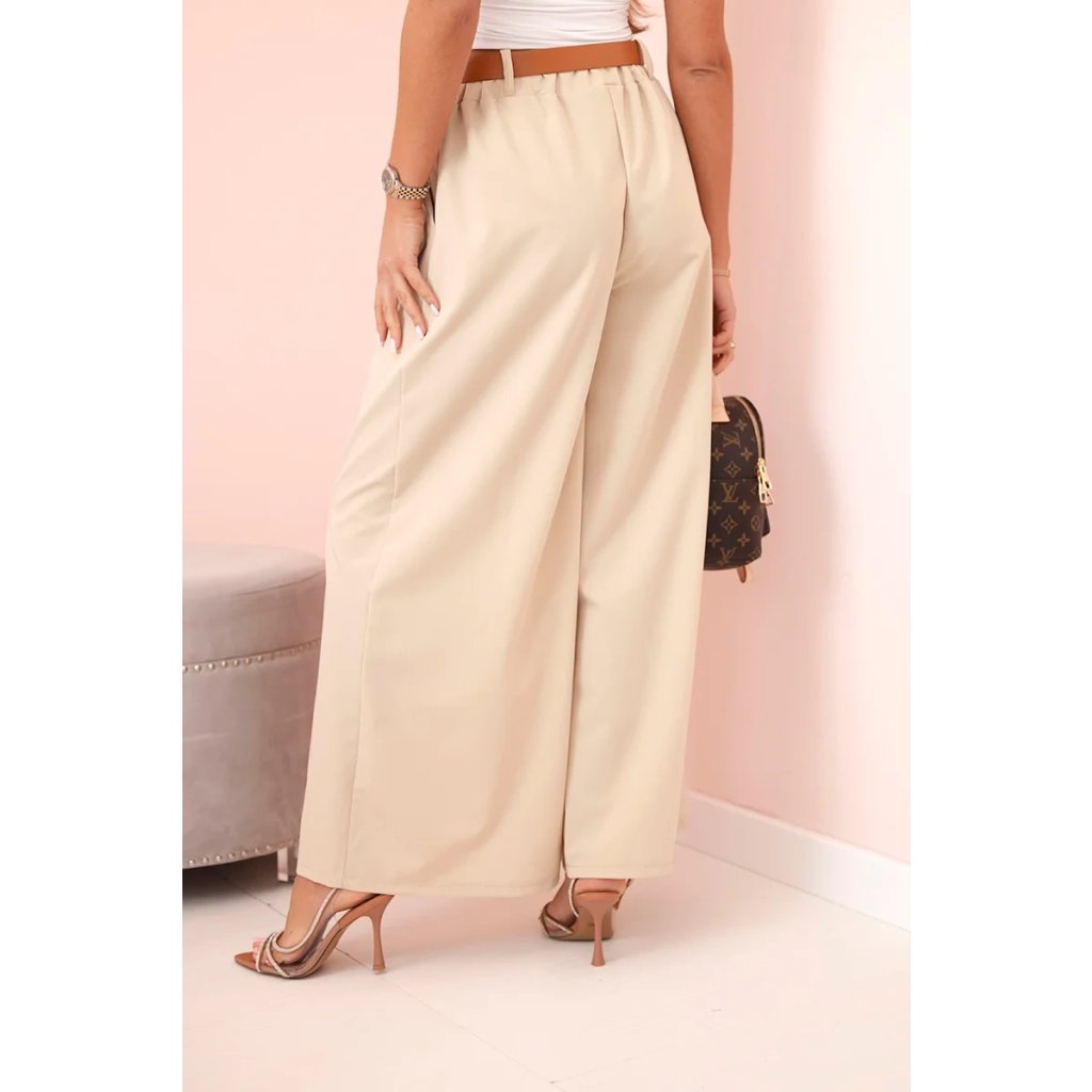 Štýlové nohavice so širokými nohavicami sú skvelou voľbou pre ženy, ktoré ocenia pohodlie a moderný vzhľad. Sú vyrobené z vysokokvalitného materiálu, perfektne sedia na postave a zvýrazňujú jej prednosti. Opasok v súprave umožňuje dokonalé prispôsobenie v páse a dodáva celku elegantný charakter. Vďaka širokým nohaviciam vyzerajú nohavice veľmi efektne a zároveň poskytujú voľnosť pohybu. Je ideálna na každodenné nosenie aj formálnejšie príležitosti - hodí sa k elegantnej blúzke, košeli alebo priliehavému svetru. Univerzálna veľkosť je vhodná pre ženy nosiace veľkosti S, M alebo L.