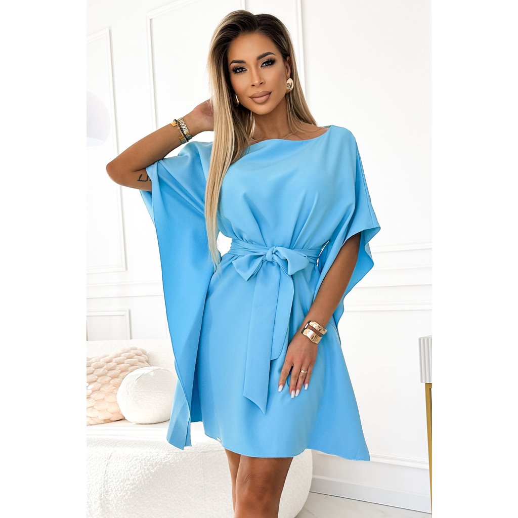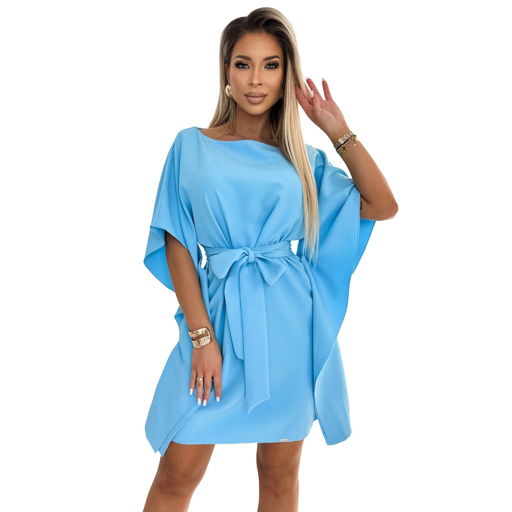 SOFIA Motýlie šaty s opaskom - svetlomodré. Vyrobené z materiálu príjemného na dotyk. Značka numoco. Poľská výroba.