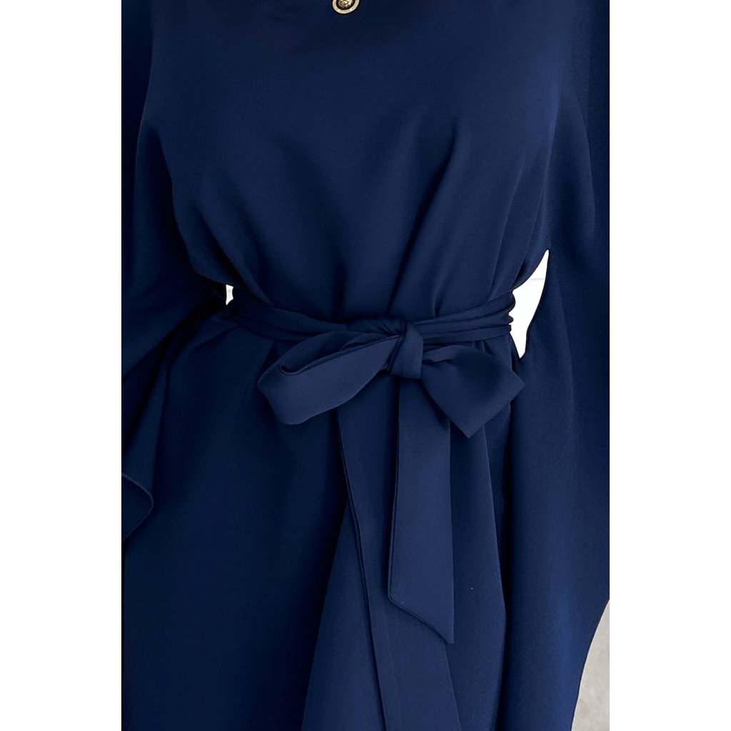 SOFIA Motýlie šaty s opaskom - tmavomodrá farba. Vyrobené z materiálu príjemného na dotyk. Značka Numoco. Poľská výroba.