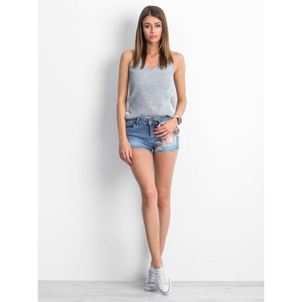 Modré kraťasy s kvetinovými aplikáciami.zloženie materiálu: 63% bavlna, 31% polyester, 3% viskóza, 3% elastan