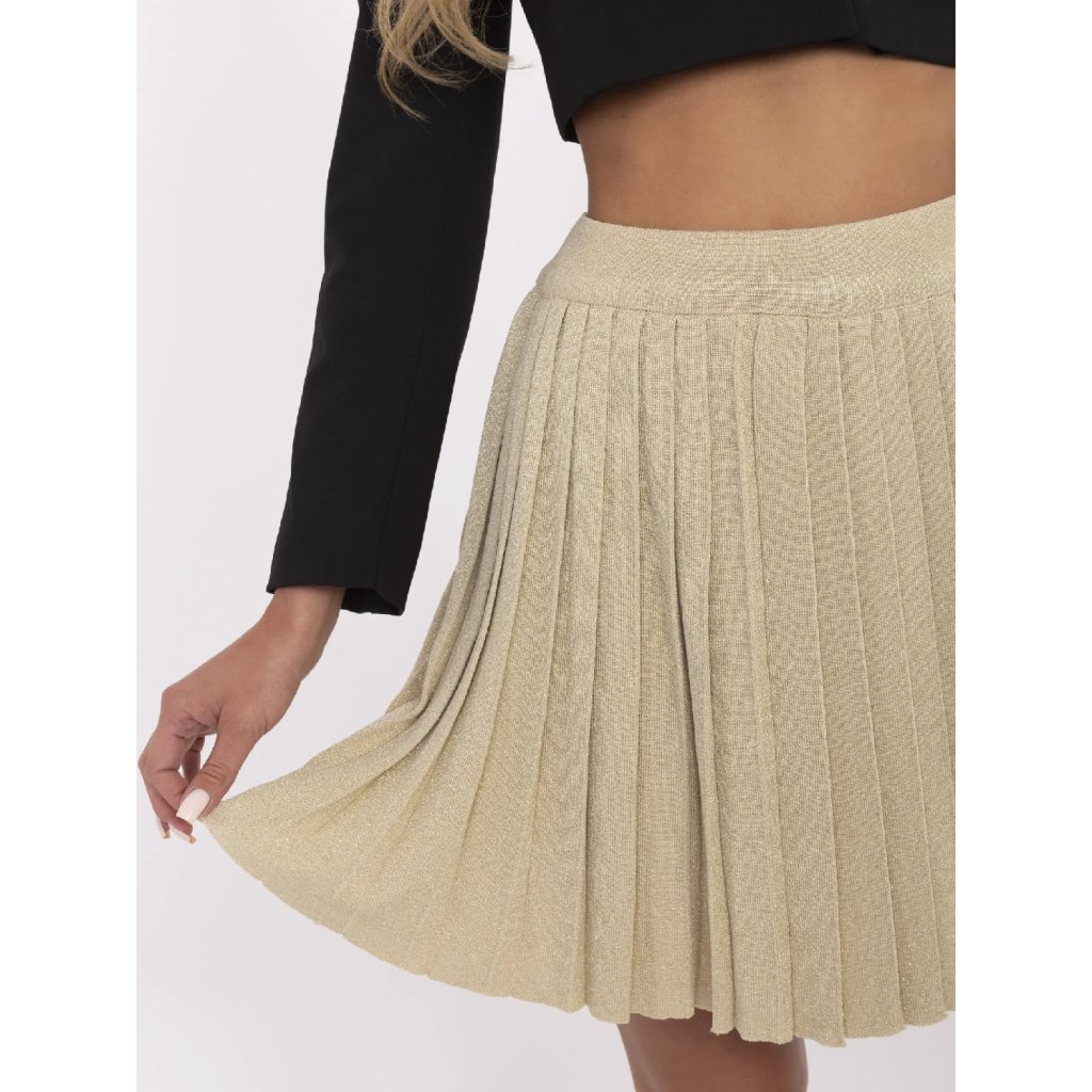Zlatá minisukňa so záhybmi. dominantný vzor: hladký štýl: elegantný príležitosť: každý deň, rande, práca Modelka má na sebe veľkosť one. Rozmery modelky: výška 176 cm, prsia 90 cm, pás 62 cm, boky 94 cm. Rozmery sukne v jednej veľkosti merané na plocho: šírka v páse - 33 cm, šírka v páse - 60 cm (po natiahnutí), celková dĺžka - 47 cm.