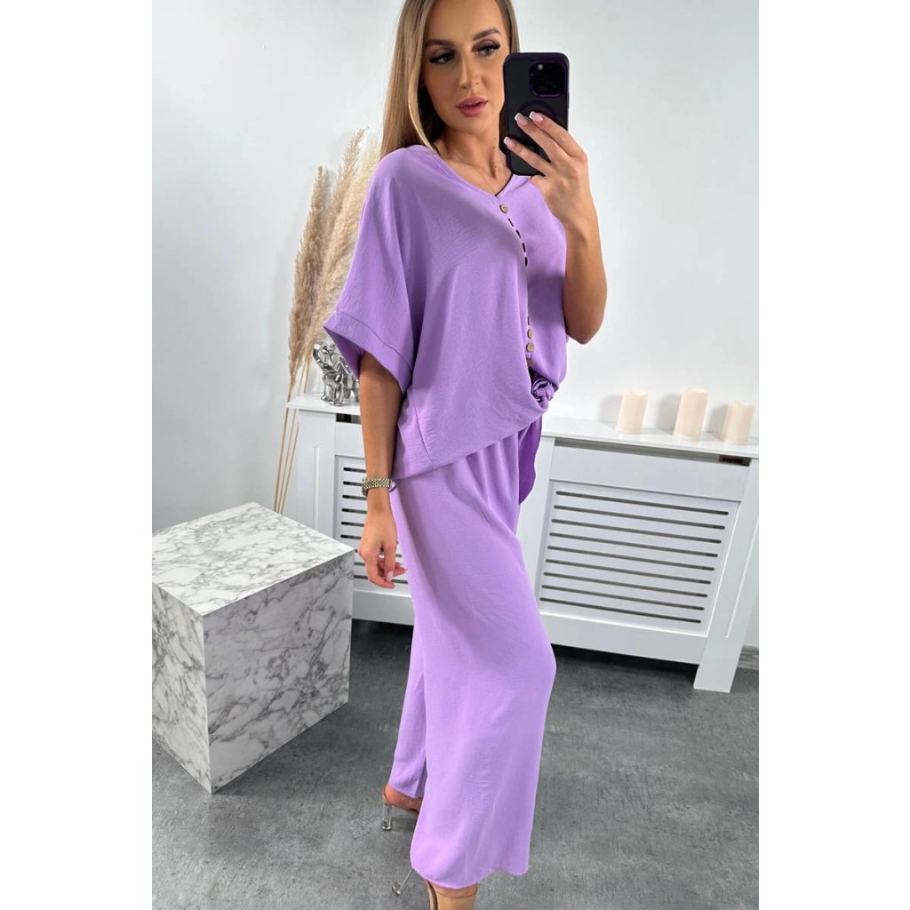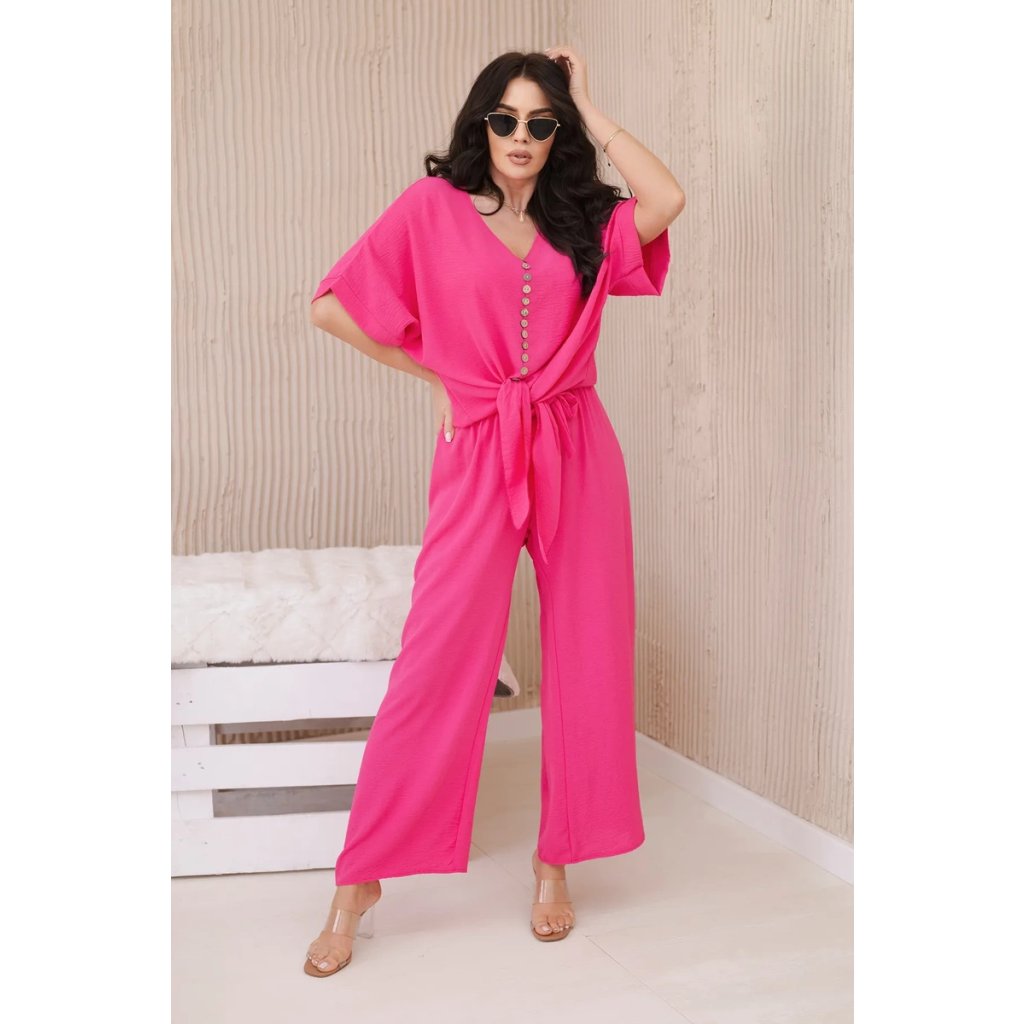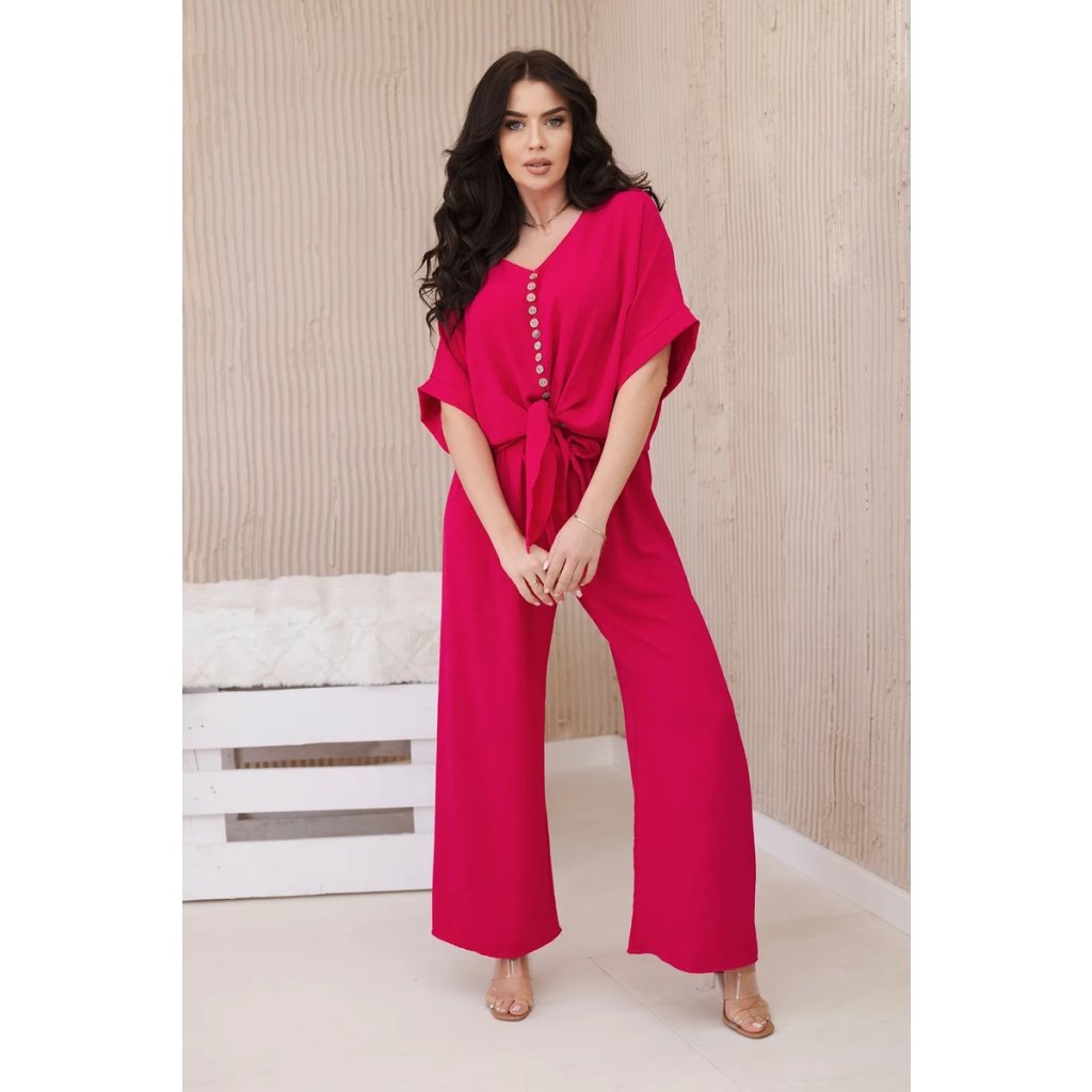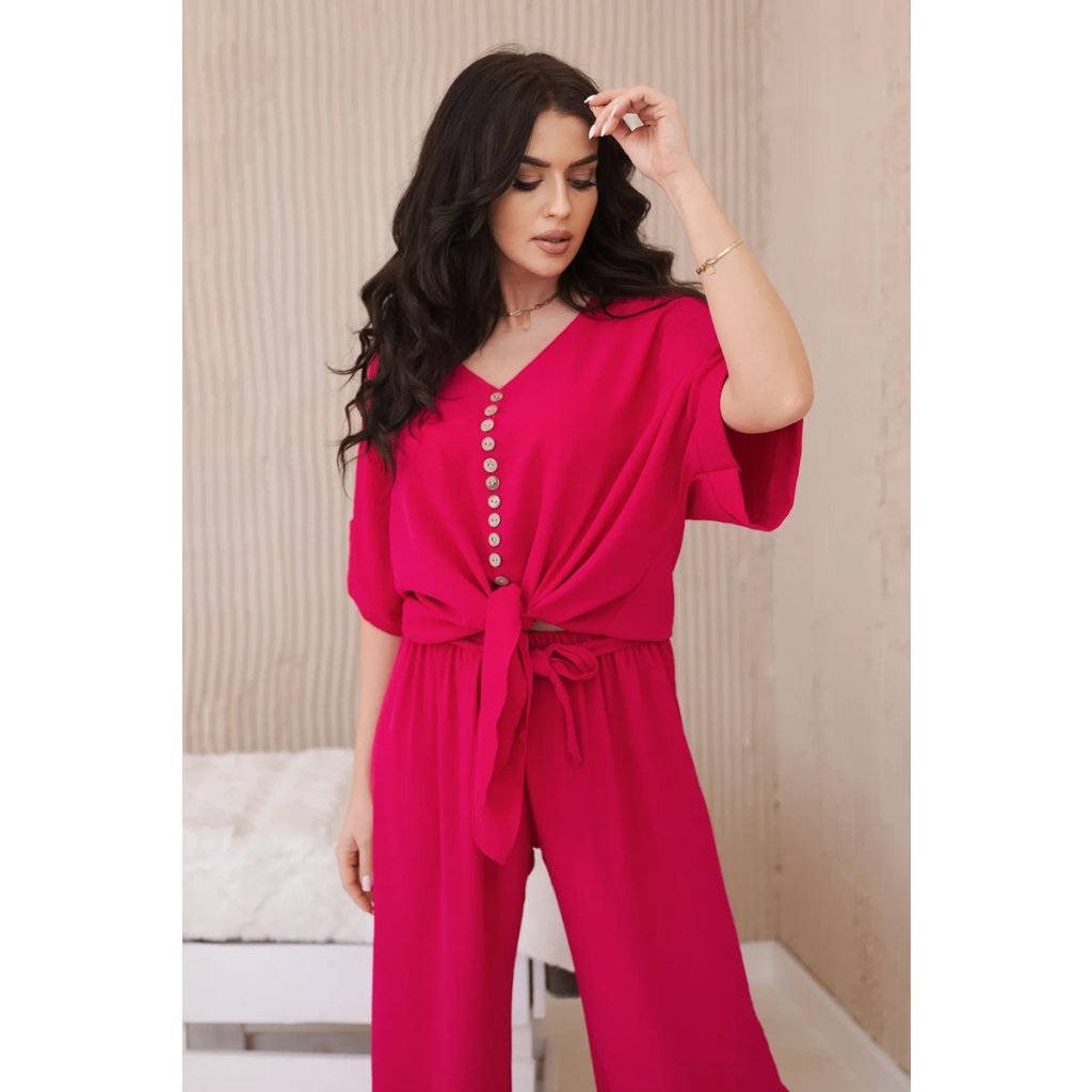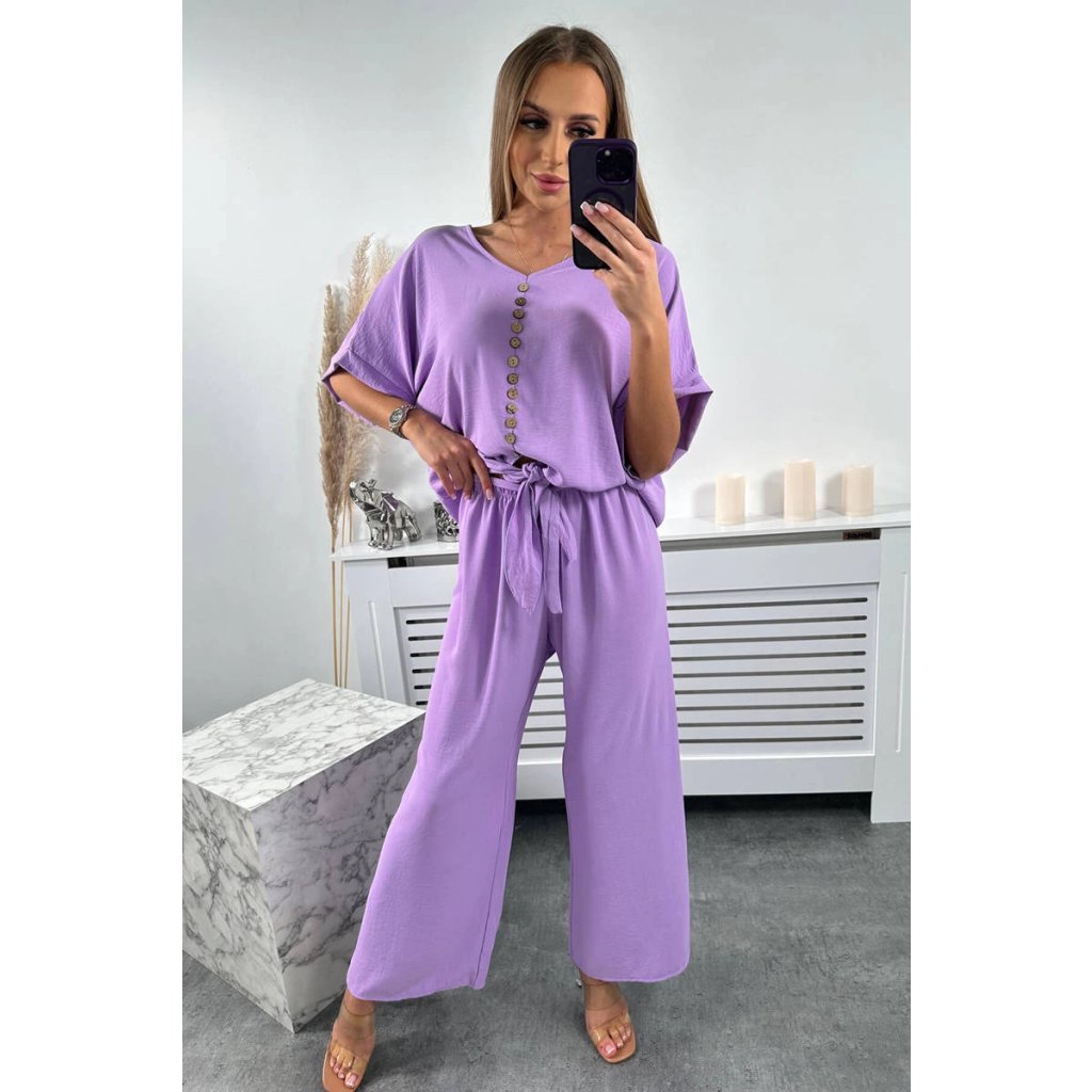 Tento taliansky komplet s blúzkou s viazaním vpredu a širokými nohavicami je ideálnou voľbou pre ženy, ktoré ocenia pohodlie a štýl v jednom. Blúzka sa zapína vpredu, čo jej dodáva jemnú ženskosť. Široké nohavice z tkaniny príjemnej na dotyk pre voľnosť pohybu a pohodlné nosenie. Takúto kompletnú súpravu môžete nosiť pri rôznych príležitostiach - do práce, na rande alebo na stretnutie s priateľmi. V kombinácii s elegantnými topánkami a doplnkami, ako je kabelka alebo šperky, vytvára štýlový a módny vzhľad. Veľkosť je univerzálna a hodí sa pre dámy veľkosti S, M alebo L.