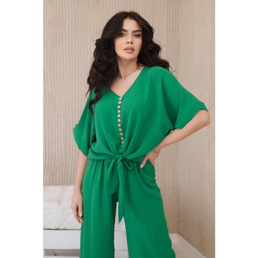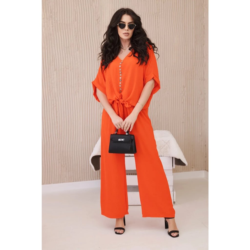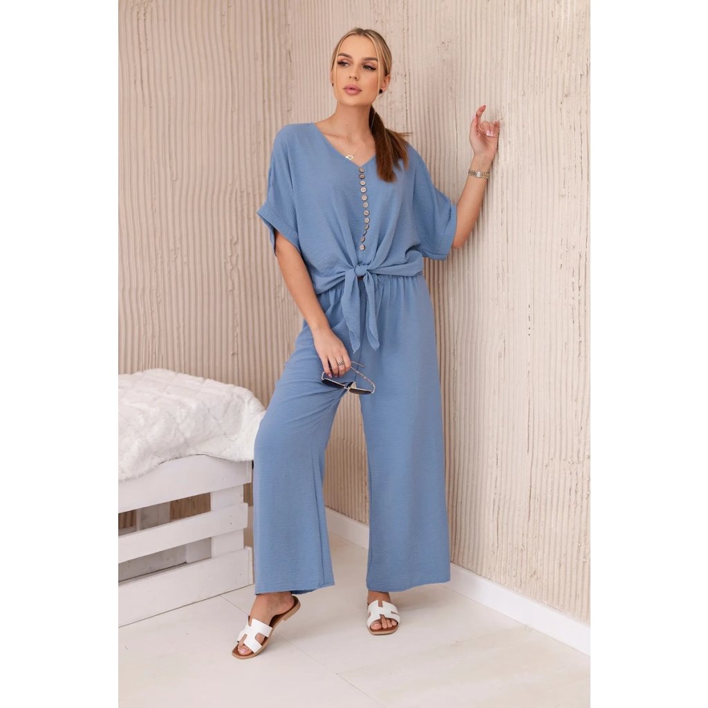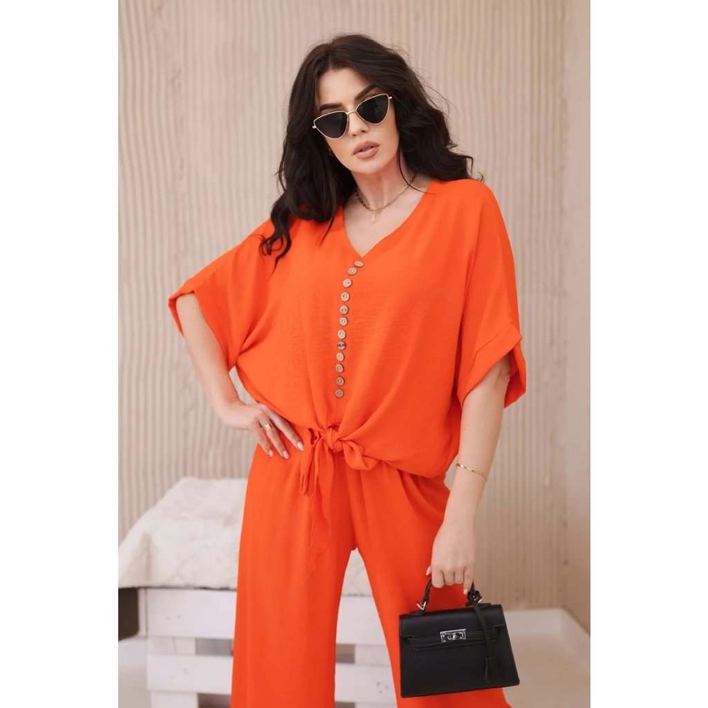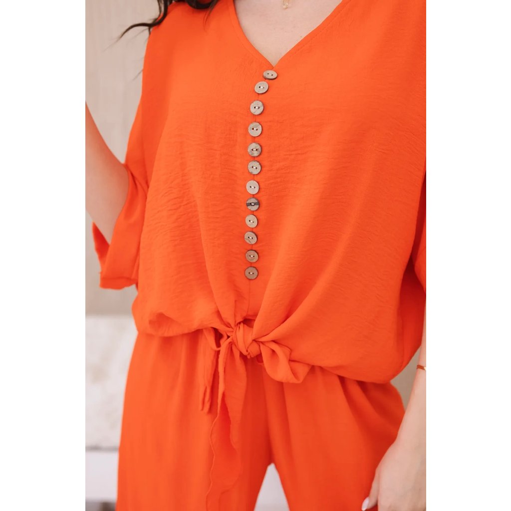 Tento taliansky komplet s blúzkou s viazaním vpredu a širokými nohavicami je ideálnou voľbou pre ženy, ktoré ocenia pohodlie a štýl v jednom. Blúzka sa zapína vpredu, čo jej dodáva jemnú ženskosť. Široké nohavice z tkaniny príjemnej na dotyk pre voľnosť pohybu a pohodlné nosenie. Takúto kompletnú súpravu môžete nosiť pri rôznych príležitostiach - do práce, na rande alebo na stretnutie s priateľmi. V kombinácii s elegantnými topánkami a doplnkami, ako je kabelka alebo šperky, vytvára štýlový a módny vzhľad. Veľkosť je univerzálna a hodí sa pre dámy veľkosti S, M alebo L.