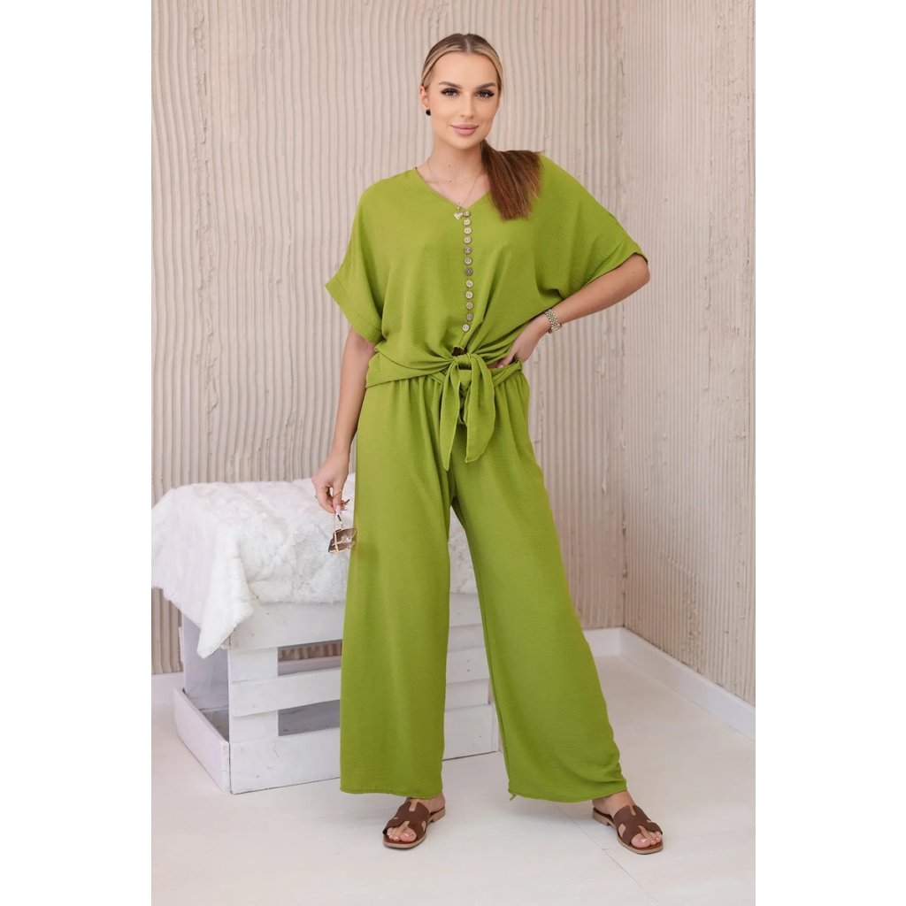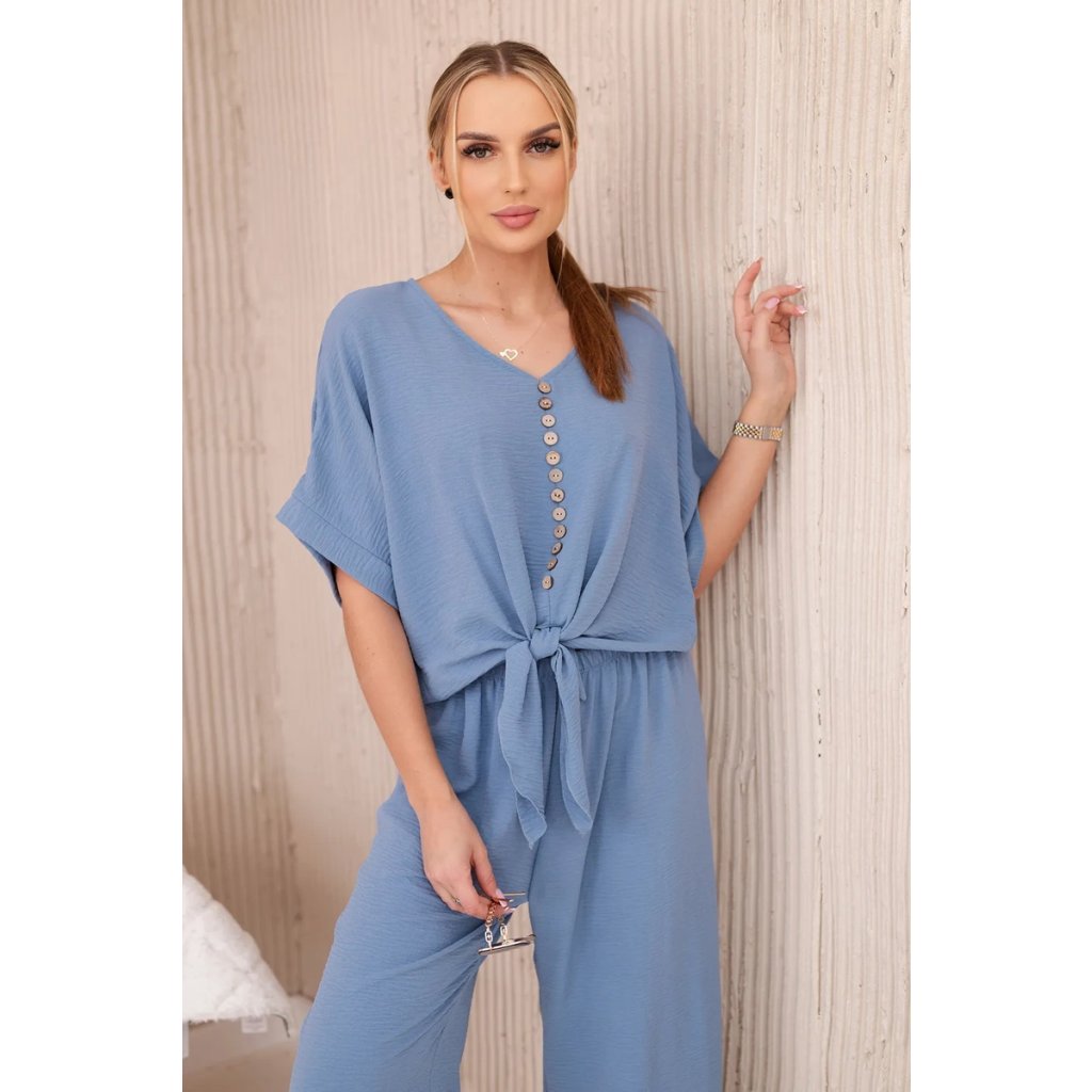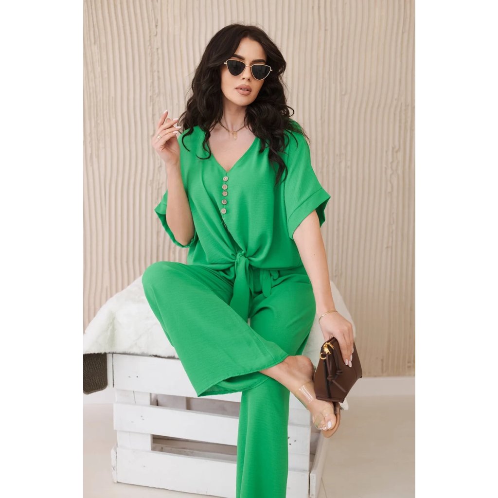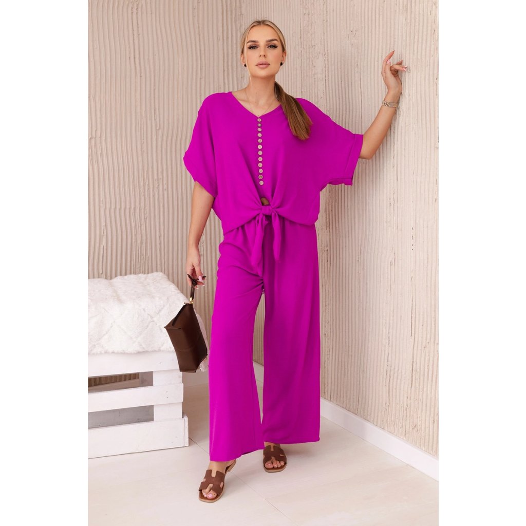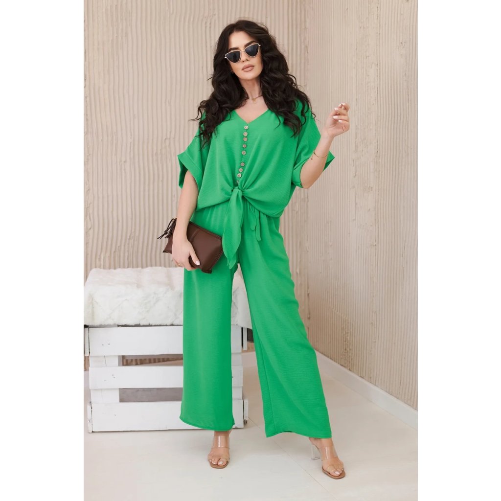 Tento taliansky komplet s blúzkou s viazaním vpredu a širokými nohavicami je ideálnou voľbou pre ženy, ktoré ocenia pohodlie a štýl v jednom. Blúzka sa zapína vpredu, čo jej dodáva jemnú ženskosť. Široké nohavice z tkaniny príjemnej na dotyk pre voľnosť pohybu a pohodlné nosenie. Takúto kompletnú súpravu môžete nosiť pri rôznych príležitostiach - do práce, na rande alebo na stretnutie s priateľmi. V kombinácii s elegantnými topánkami a doplnkami, ako je kabelka alebo šperky, vytvára štýlový a módny vzhľad. Veľkosť je univerzálna a hodí sa pre dámy veľkosti S, M alebo L.