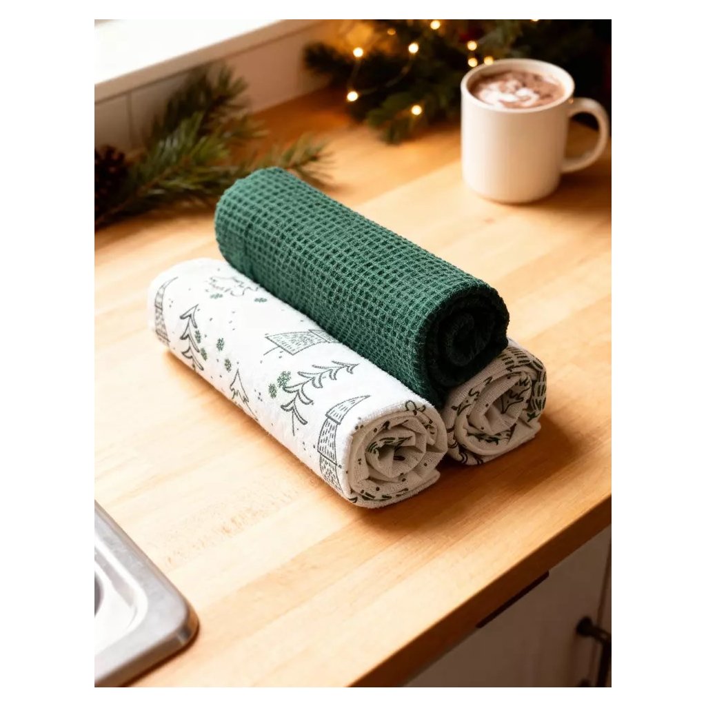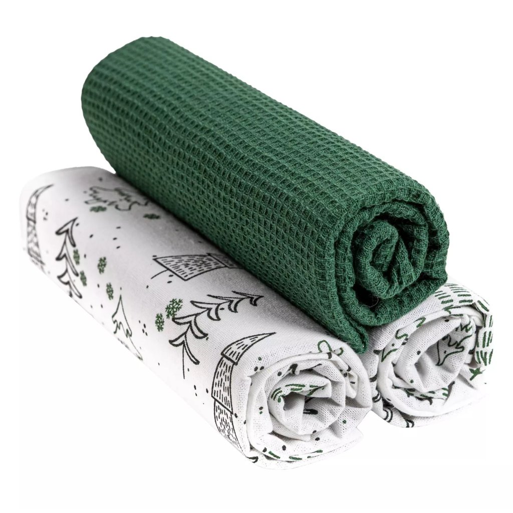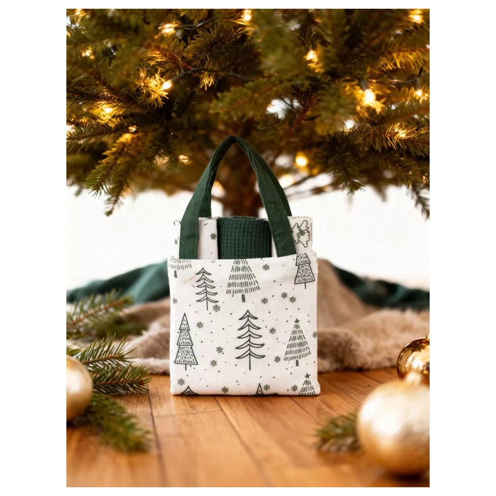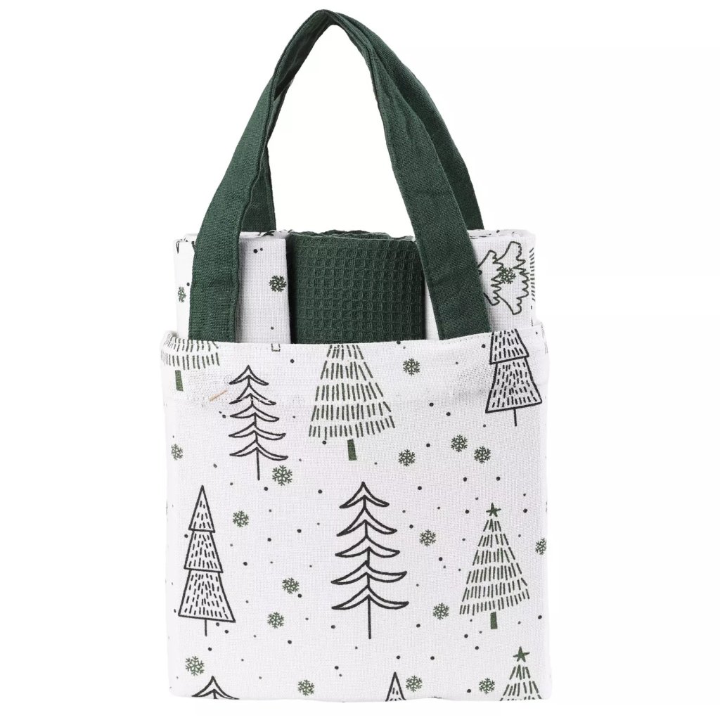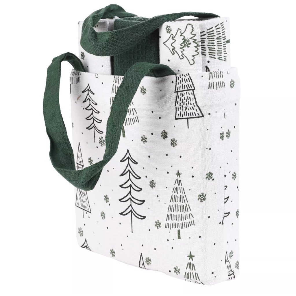 Súprava kuchynských utierok obsahuje 2 bavlnené utierky zdobené vianočným motívom a jedna utierka je sýto zelená s vaflovou štruktúrou. Celé je to zabalené v štýlovej, vypasovanej taške s uchami, ktorá sa bude skvele hodiť aj ako darčekové balenie. Utierky sú vyrobené zo 100% bavlny, rozmer 40 x 70 cm.