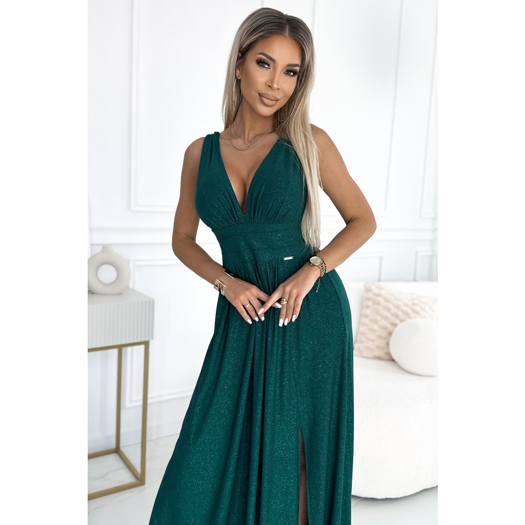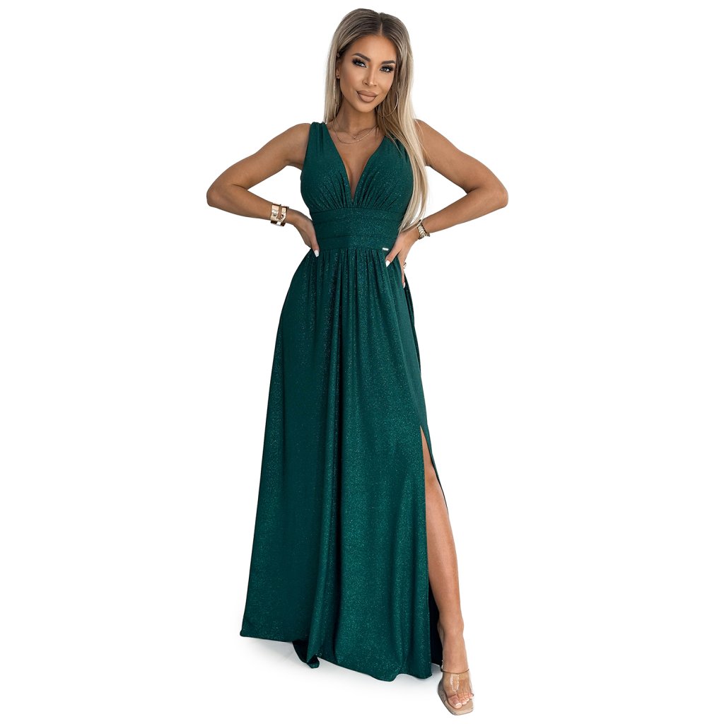 SUSAN - dlhé šaty s výstrihom, rozopínaním na nohaviciach a prešívaním v páse. Z elastického materiálu s trblietkami - zelená. Ideálne na svadby, Silvestra, ples alebo karneval. Poľský výrobok. Značka Numoco.