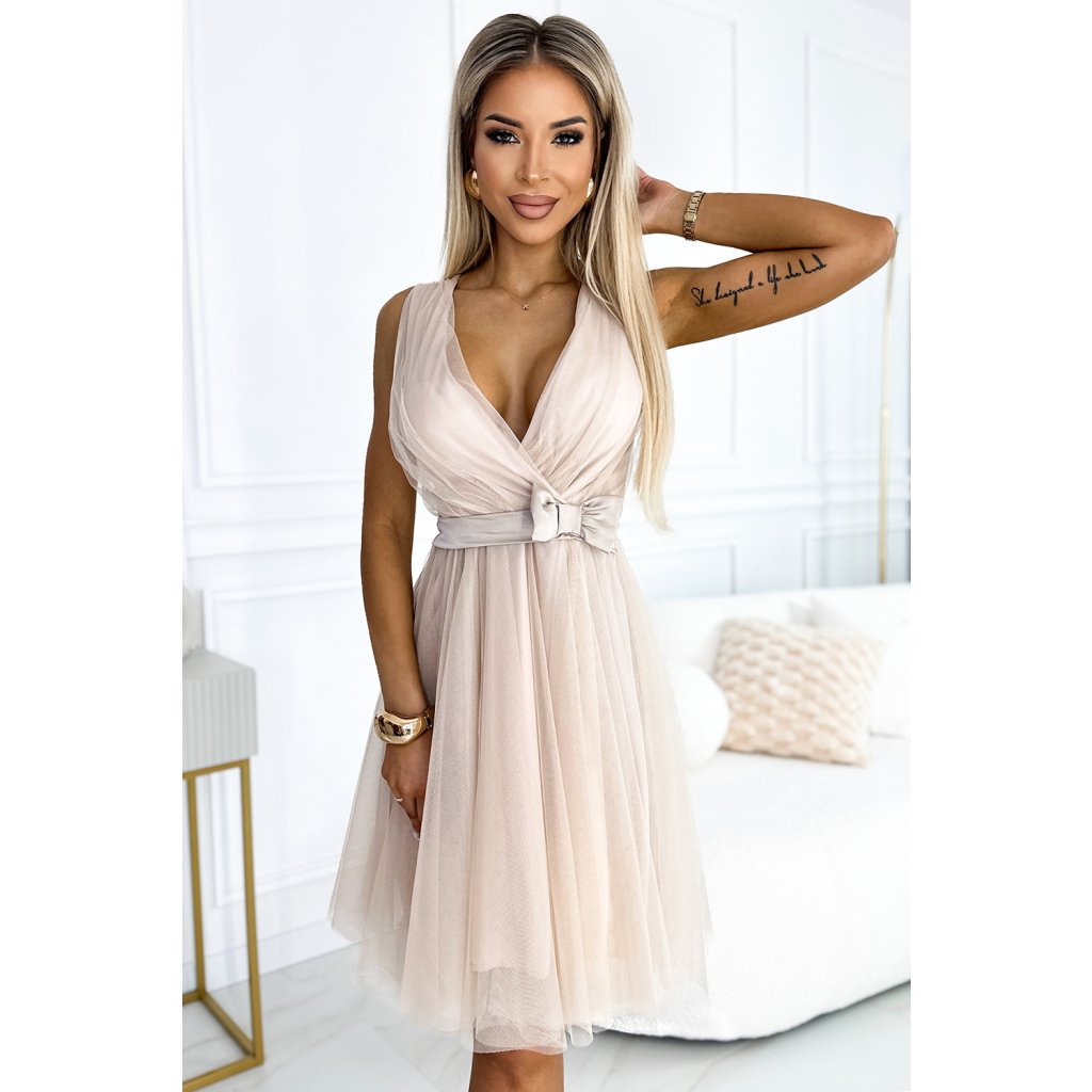 Tylové šaty s výstrihom a mašľou - béžové 523-3