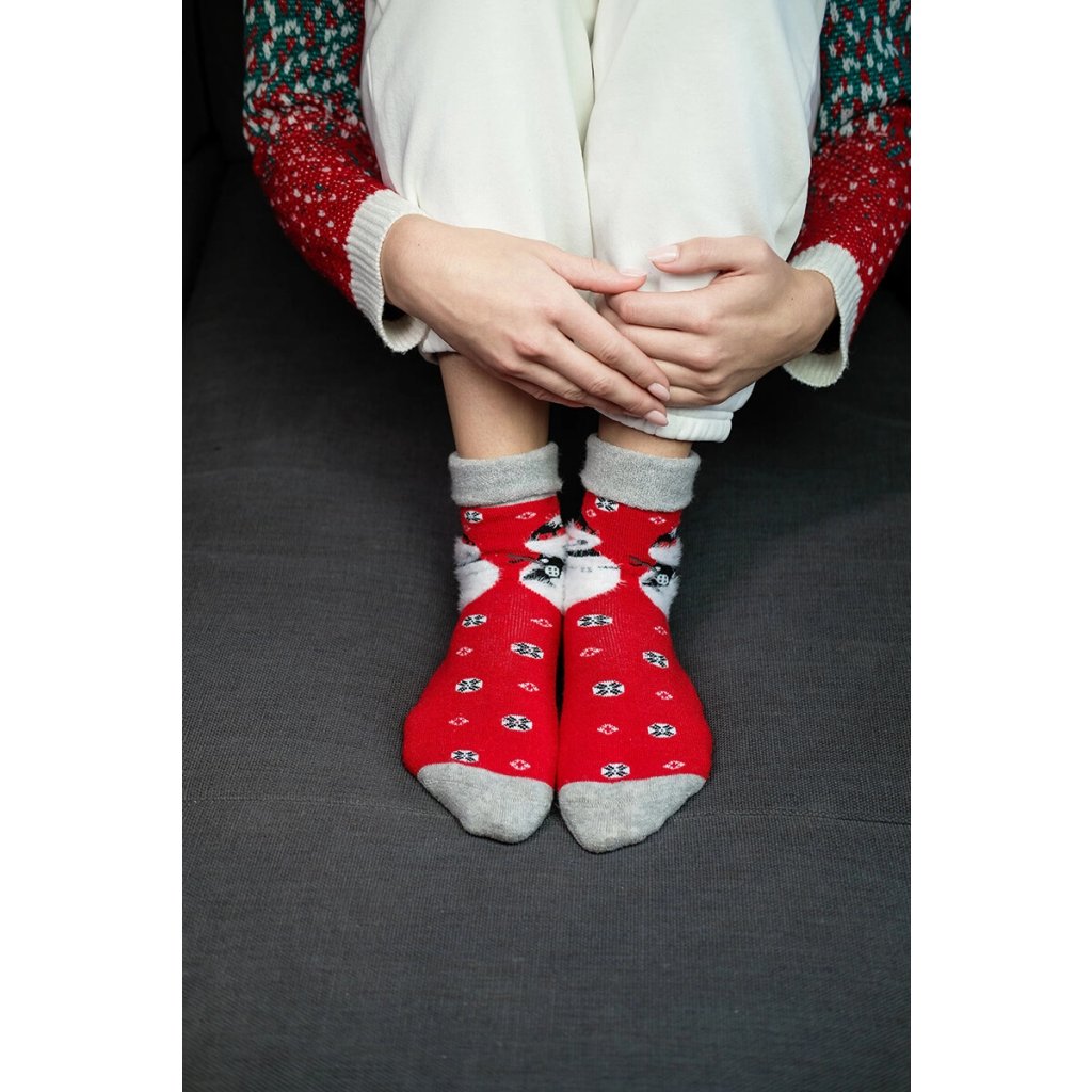 Tieto ponožky sú ideálnou voľbou na chladné dni – na nosenie doma, počas vianočného večera s rodinou, a tiež ako doplnok k darčeku. Mäkká pletenina a príjemné, kožušinkové prvky zaisťujú maximálny komfort a teplo. Je to drobnosť, ktorá vykúzli úsmev a postará sa o pohodlie vašich nôh v zimných dňoch.