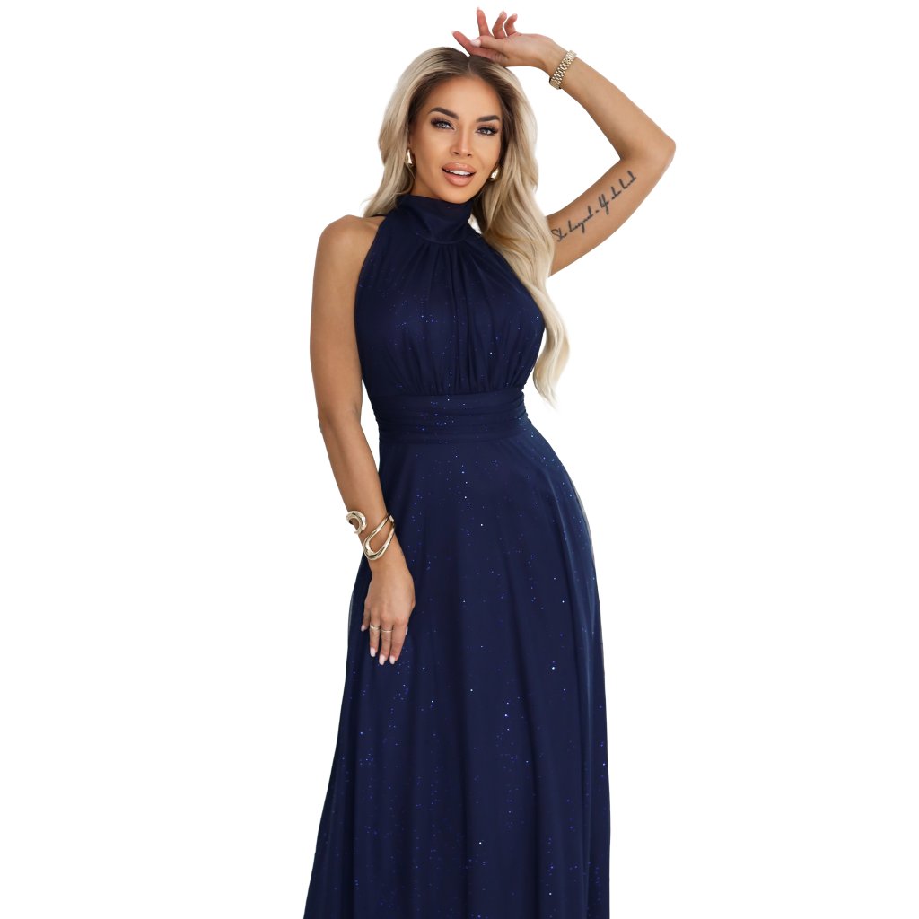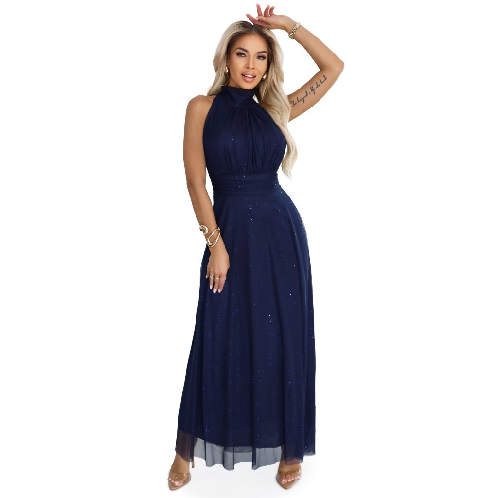 Veronica sú výnimočným návrhom pre ženy, ktoré si želajú vynikať eleganciou a triedou počas tých najvýnimočnejších príležitostí. Dlhé šaty maxi v námornícky modrej farbe sú vyrobené z trblietavého materiálu, ktorý krásne svieti vo svetle, zdôrazňujúc šik charakter kreácie. Horná časť s efektným stojačikom a jemnými riasením opticky zoštíhľuje siluetu, zatiaľ čo ľahko rozšírená spodná časť dodáva celku ľahkosť a výnimočnú gracióznosť.