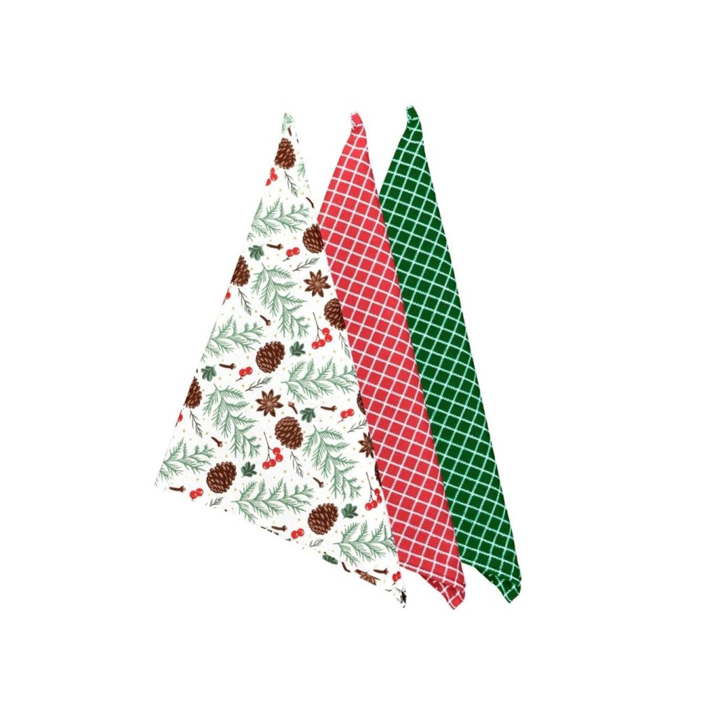 Štýlová súprava vianočných utierok s motívom šišiek, ihličia a bobúľ doplnená o klasické kockované vzory v červenej a zelenej farbe. Skvelý doplnok do kuchyne pre sviatočné obdobie.